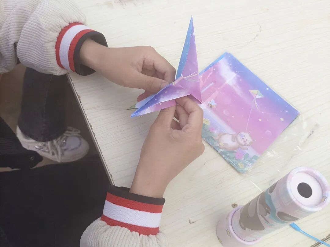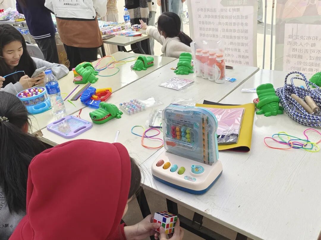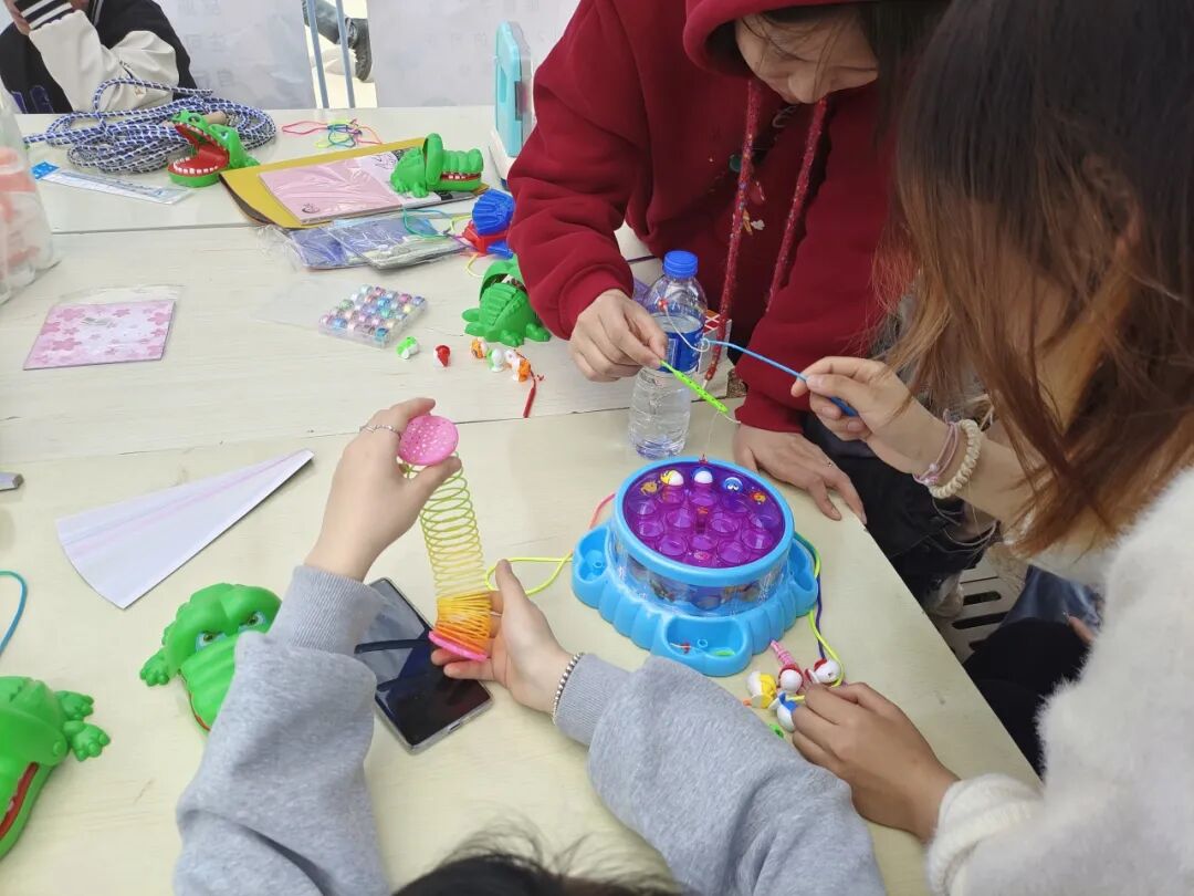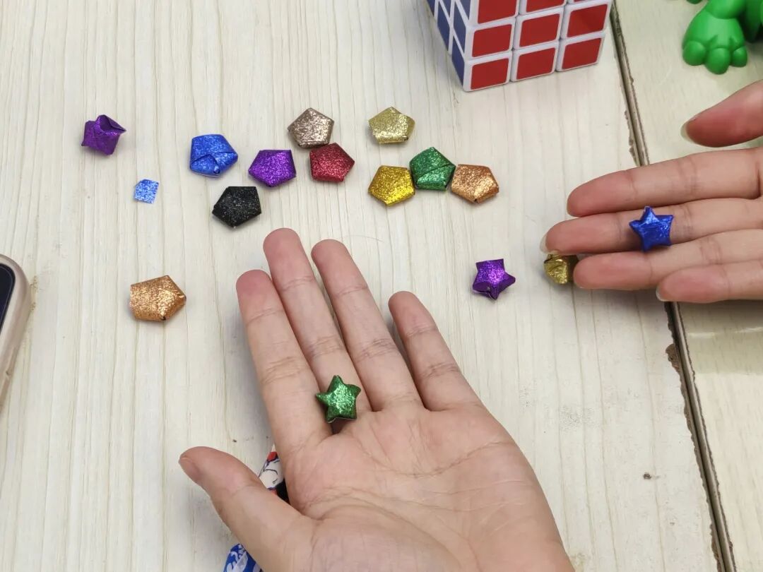 现场还有3个很安静的摊位,分别是“彩绳编织”“星星纸制作”“折纸艺术”,这是专门为喜静不喜动的同学们准备的,同学们一起认真地动手制作,互相帮助,运用手工材料和工具,创作出了各式各样的童年手工艺品。在创作过程中,同学们分享创意,不仅锻炼了动手能力,还增进了彼此之间的情感交流。