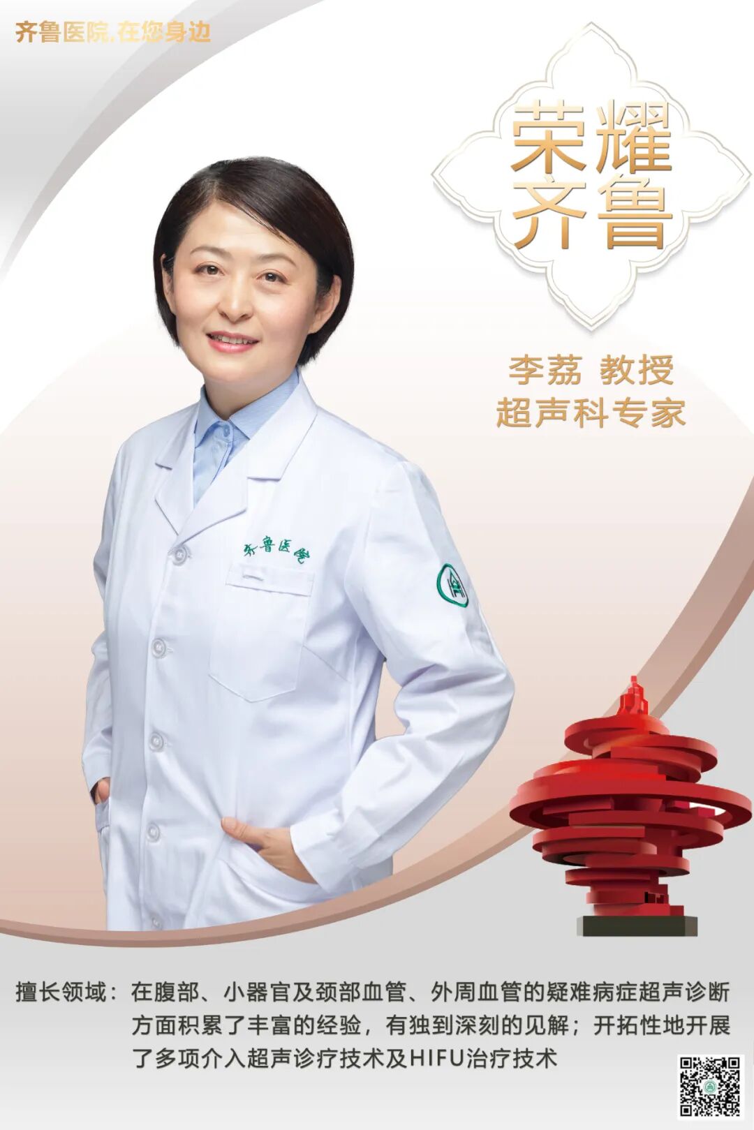 济南青岛专家联动,齐鲁医院在您身边 山东大学齐鲁医院(青岛)超声科专家 李荔 教授 擅长领域:在腹部、小器官及颈部血管、外周血管的疑难病症超声诊断方面积累了丰富的经验,有独到深刻的见解;开拓性的开展了多项介入超声诊疗技术及HIFU治疗技术 温馨提示:请务必提前通过微信公众号“山东大学齐鲁医院青岛院区”“齐鲁医院青岛院区”或致电0532-96599预约,并请携带本人有效身份证件就诊,谢谢您的配合! 李荔,山东大学齐鲁医院(青岛)超声科副主任,主任医师,硕士研究生导师,山东省十佳超声医师。 从事超声诊疗、肿瘤超声诊断临床工作30余年,2013年创建山东大学齐鲁医院(青岛)超声科,科室目前在青岛地区同级医院技术创新能力及影响力名列前茅。2019年7月赴日本独协医科大学访学半年。曾任山东第一医科大学第一附属医院(省千佛山医院)超声诊疗中心主任。 学术兼职: 中国医师协会超声分会血管超声专业委员会 副主任委员 中国卒中学会超声分会 首届副主任委员 全国住院医师规范化培训年度业务水平测试超声专业 命题专家 中国医师协会超声分会 委员 中国医学影像技术研究会 常务理事 中国医疗保健国际交流促进会超声医学分会 常务委员 中国医疗保健国际交流促进会甲状腺分会 常务委员 山东医师协会超声医师分会 副主任委员 山东中西医结合学会超声分会 副主任委员 山东省超声质控中心 委员 青岛医学会超声分会副主任委员 科研与获奖: 获山东省科技进步三等奖3项,主持山东省医药卫生科技发展计划项目课题1项,主编、副主译各一部、参编四部医学著作并出版,以第一作者和通讯作者在国内外专业杂志发表论著40余篇。 荣耀齐鲁 专家汇总 【“齐鲁医院 在您身边”之荣耀齐鲁】耳鼻咽喉头颈外科专家潘新良教授 【“齐鲁医院 在您身边”之荣耀齐鲁】放射科专家马祥兴教授 【“齐鲁医院 在您身边”之荣耀齐鲁】神经外科专家王志刚教授 【“齐鲁医院 在您身边”之荣耀齐鲁】内分泌科专家何兰杰教授 【“齐鲁医院 在您身边”之荣耀齐鲁】神经内科专家焉传祝教授 【“齐鲁医院 在您身边”之荣耀齐鲁】超声科专家李杰教授 【“齐鲁医院 在您身边”之荣耀齐鲁】儿内科专家杨杰教授 【“齐鲁医院 在您身边”之荣耀齐鲁】乳腺外科专家高海东教授 【“齐鲁医院 在您身边”之荣耀齐鲁】放射科专家孟祥水教授 【“齐鲁医院 在您身边”之荣耀齐鲁】心内科专家葛志明教授 【“齐鲁医院 在您身边”之荣耀齐鲁】心内科专家钟敬泉教授 【“齐鲁医院 在您身边”之荣耀齐鲁】重症医学科专家吴大玮教授 【“齐鲁医院 在您身边”之荣耀齐鲁】脊柱外科专家郑燕平教授 【“齐鲁医院 在您身边”之荣耀齐鲁】麻醉科专家李建军教授 【“齐鲁医院 在您身边”之荣耀齐鲁】耳鼻咽喉头颈外科专家刘大昱教授 【“齐鲁医院 在您身边”之荣耀齐鲁】心外科专家孙文宇教授 【“齐鲁医院 在您身边”之荣耀齐鲁】脊柱外科专家司海朋教授