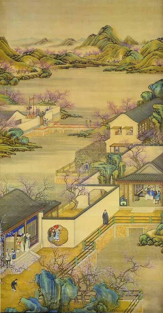 《雍正十二月行乐图》是清朝宫廷画家郎世宁所创作的一组表现雍正皇帝日常生活的作品,按春、夏、秋、冬四季12个月的顺序排列。“二月踏青” 描绘的是雍正皇帝在圆明园游春的场景。画面富丽堂皇,气象森严,体现出有别于民间赏春游春的宫廷生活,是清代院画风格的折射。