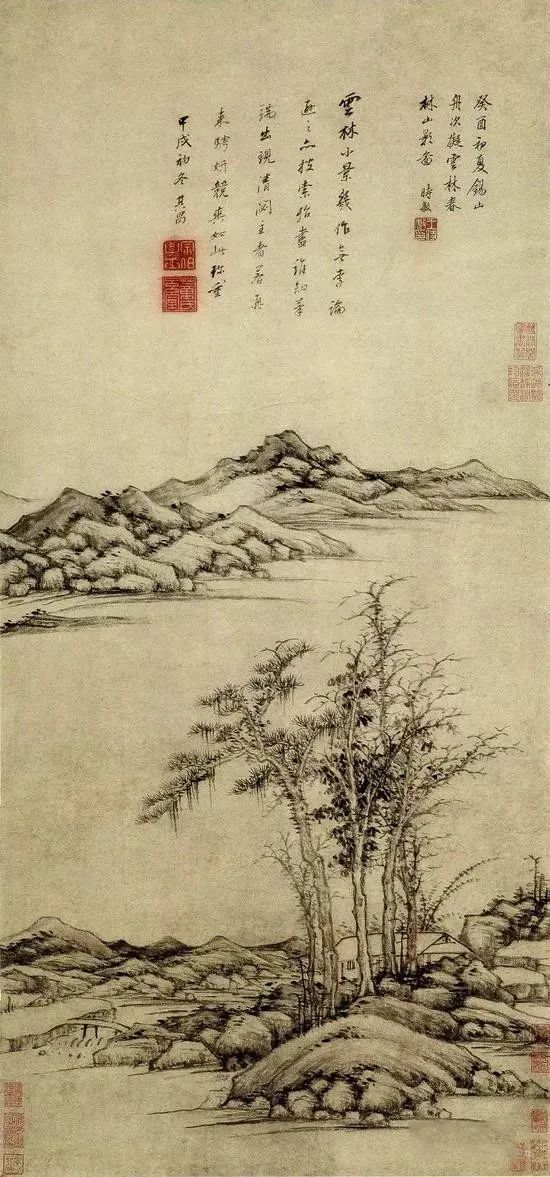 王时敏《仿倪瓒春林山影图》, 纸本水墨,纵94.3cm、横43.8cm,现藏于上海博物馆,系王时敏42岁游倪瓒老家无锡时,触景生情,情寄笔端,以倪瓒笔意绘制而成的山居景致,乃王时敏早期临古阶段的精彩之作。