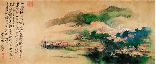 《杏花春雨图》是变革时期一幅具有代表性的精心之作。张大千以酣畅不失空灵的传统构成和雄厚不失清丽的写意精神,在大千世界的另一端成就了一幅可居、可游,但似乎又是可望而不可及的江南梦中景象。此图采用传统的平远和深远相结合的方式,用笔在传统的技法上采用泼写相兼的方法,让画面更显气势灵动。