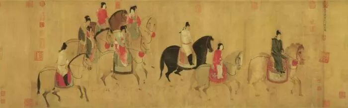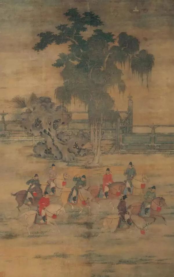 八名衣冠华贵之仕,骑着骏马出游,或回首召唤,或挥鞭促行,人马各有不同的神情与动态,相互间则有顾盼之连系。园林中的草木呈现新绿之色,马匹踏着轻快步,表现出春游之愉悦气氛。