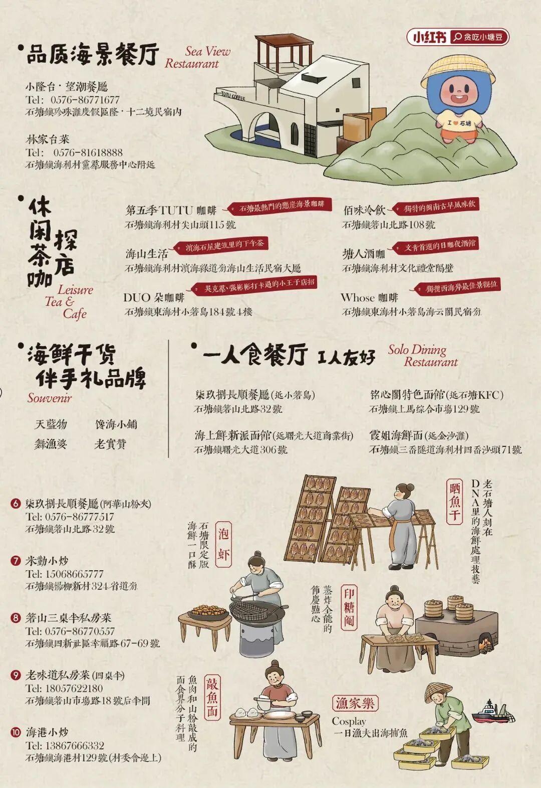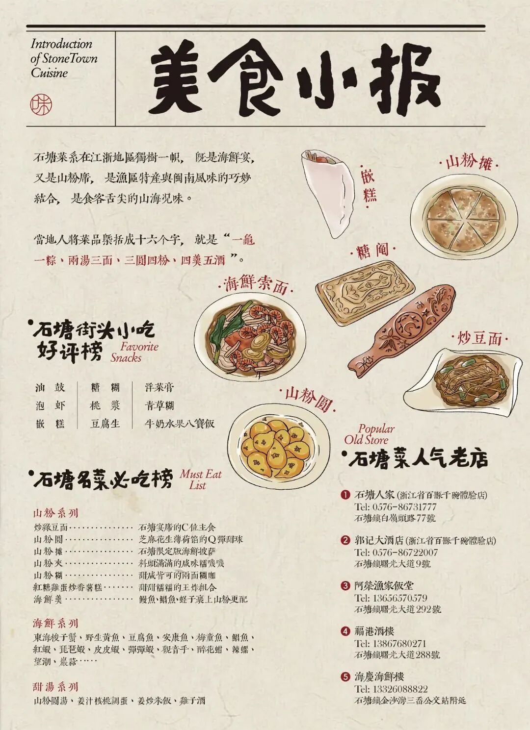 「来石塘吃什么?」石塘本地人都在哪吃?石塘文旅推荐官——贪吃小塘豆为大家整理了保姆级石塘美食藏饱图收下这份“City Eat”指南跟着吃不踩雷~不得不看的吃货指南石塘菜系在江浙地区独树一帜既是海鲜宴,又是山粉席是渔区特产与闽南风味的巧妙结合亦是食客舌尖的山海况味 温岭美食真~鲜~呀石塘是海鲜饕餮的乐土小网海鲜肉质鲜美、品类繁多三鲳、四鳓、春鲈、夏鲻……素有“东海第一鲜”之称真~糯~呀石塘的小吃自成一派“一龟一粽,两汤三面,三圆四粉,四羹五酒”这一俗语深入人心真~香~呀咸味的鳗鱼叽、鲷鱼叽、虾叽、水潺叽甜味的蜜枣叽、冬瓜糖叽刚炸好的叽热乎乎的放进嘴里香、嫩、脆根本停不下来 温岭美食迷道赞些!全都是本地人的良心推荐别忘了收藏转发这份美食小报一起打卡地道美食信息来源:吉祥石塘 转载请说明出处 内容投诉内容投诉九幽软件 » 温岭美食(温岭美食节)