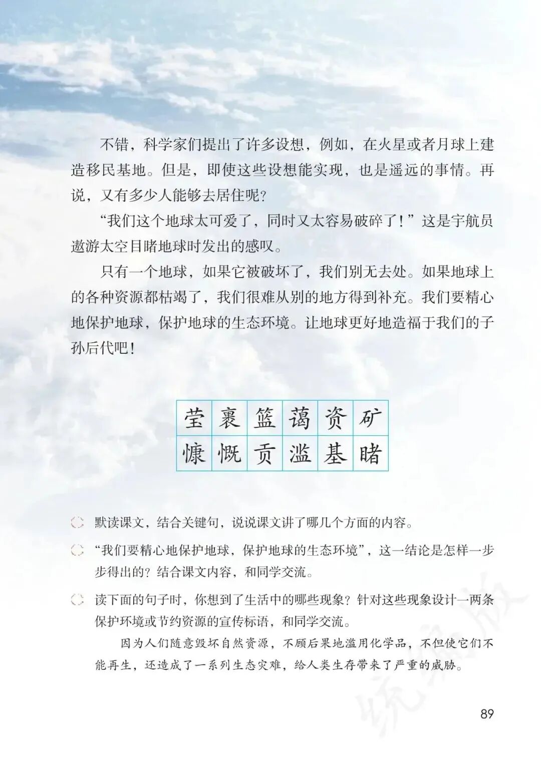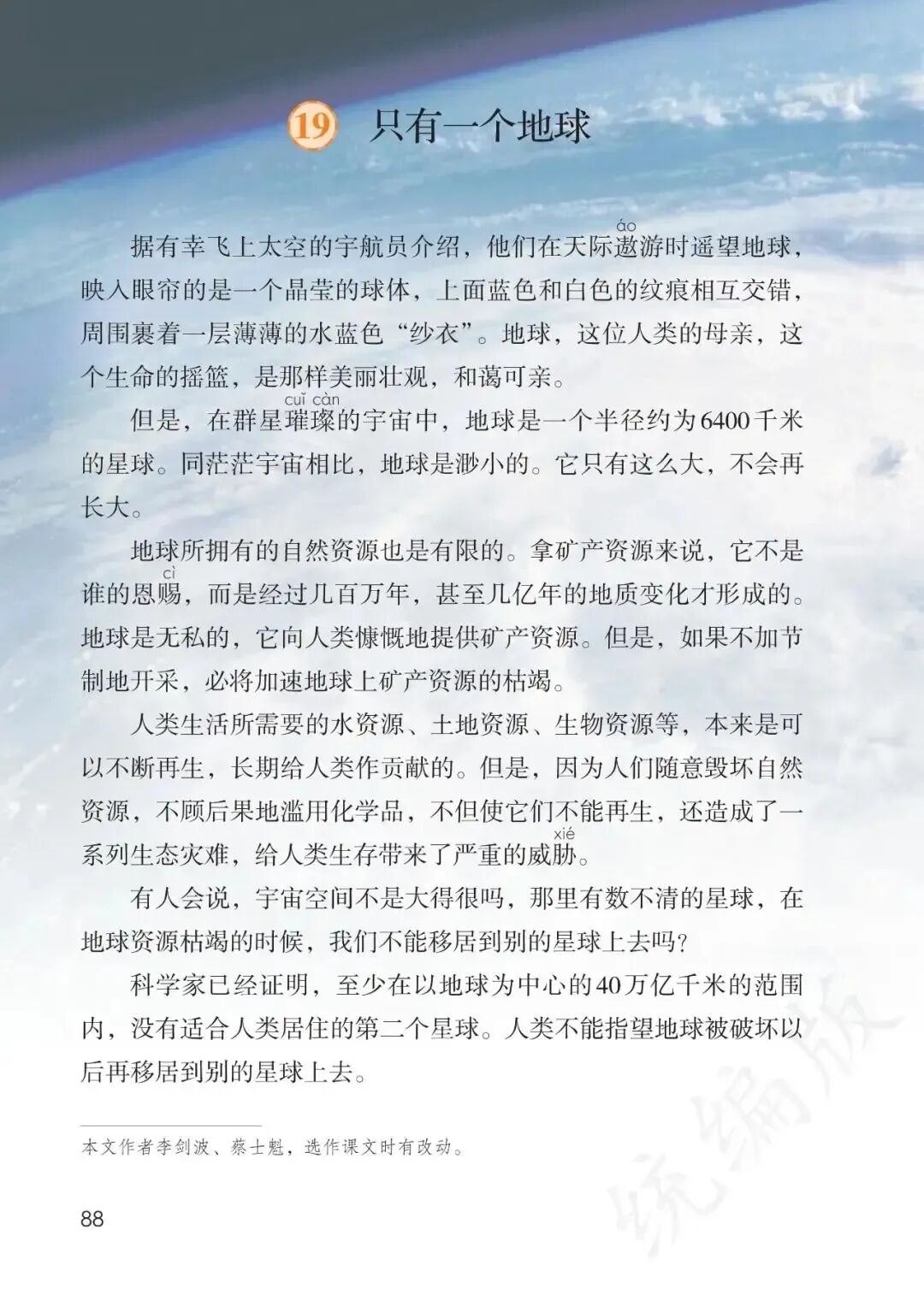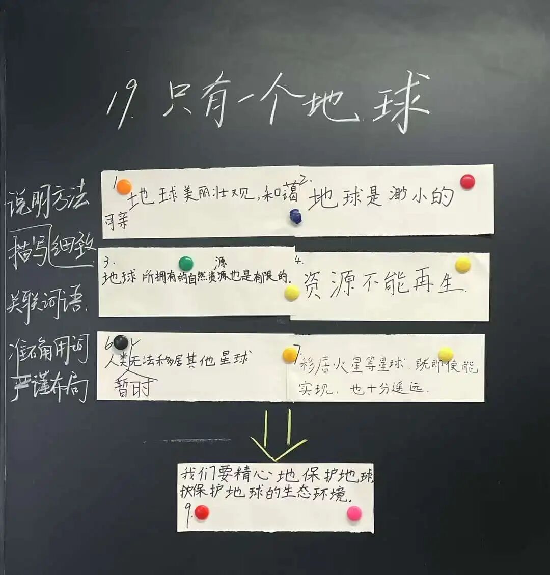 统编六上第19课《只有一个地球》是一篇以说理为目的的科普说明文,课文围绕“只有一个地球”,从“地球美丽壮观、和蔼可亲,但是又很渺小”“地球资源有限,且不可再生”“暂时无法移居”等三方面说明了地球的唯一性,从而得出“我们要精心地保护地球,保护地球的生态环境”这一结论。 在研读课文的过程中,我发现,作为一篇说明文,运用列数字、打比方、做假设等说明方法来说明事物特点的写法在本文中并不明显,本文值得品味的,是作者如何通过细致的描写、逻辑严密的关联词语和材料组织的顺序等方面的“写法秘诀”。因此,对于本篇课文的教学,我主要就围绕作者如何说清观点而引导学生在“怎么写”(关联词语的运用、说明方法、描写手法的使用等)上下足功夫,并在读懂“细节部分怎么写”的基础上,引导学生发现课文在选材组材上如何谋篇布局的秘密,感受到课文严密的说理逻辑。 课后三道习题,分别从内容梳理、写法探究和拓展延伸等三方面为我们绘制了本课教学的蓝图: 课后习题一对接单元语文要素,引导学生在初读课文时,通过对各部分内容中的关键句的寻找,把握课文主要内容;课后习题二旨在引导学生从写法的教学读懂课文是如何一步一步、层层推进地得出最后的结论的;课后习题三则要求学生由课文中对于环境问题的提及而关注生活中的资源浪费等问题,并以写宣传标语的方式加深对此类问题的看法,从某种意义上来说,这也是在为本单元习作中学写倡议书时关注生活中的问题进行预热。 基于以上认识,我拟对本课两课时教学内容作如下安排: 1.开课揭题,点明文体——说明文。 2.默读课文,抓住关键语句,理清课文主要内容。(对焦课后习题一) (1)自读课文,圈画每部分内容的关键语句。 (2)交流核对自学成果,随机指名书写板贴。 (3)对板贴关键语句进行归类,理清课文是从三方面内容来说明观点的。 提示:第3、4段内容都和“资源”有关;第1、2段之间由“但是”链接;第6、7段内容都与“移居”有关;理清板贴中观点与结论的关系。 3.以“地球的美丽渺小”为“教”。 (1)自读课文第1、2段,思考课文是如何将地球的美丽又渺小的观点说清楚的,圈画关键语句,批注阅读感受。 提示:生动形象、细致入微的描写、列数字的说明方法、准确的说明文语言(如“一个半径不到6400千米”如何通过“不到”让读者感受到地球的渺小)等。 (2)再读课文,思考第1段和第2段的顺序是否可以调换,感受作者“先写优点,再谈不足”之写法的表达效果。 (3)联系第1、2段的主要观点与第9段中的结论,进行说话训练。 4.以“地球资源有限且不可再生”为“扶”。 (1)自读课文第3、4段,思考课文是如何将地球的资源有限且不可再生的观点说清楚的,圈画关键语句,批注阅读感受。 提示:列数字的说明方法、“不是……而是……甚至……”“但是,如果……必将……”“本来是……但是,因为……不当……还”等关联词语的大量使用。 (2)再读课文,思考课文第3段和第4段的顺序是否可以调换,感受作者“先写资源有限,再写‘原本可再生的资源不可再生’”之写法的表达效果。 (3)联系第3、4段的主要观点与第9段中的结论,进行说话训练。 6.以“无法移居”为“放”。 (1)自读课文第6、7段,思考课文是如何将无法移居的观点说清楚的。 提示:列数字的说明方法、准确的说明性语言(“至少”)、“但是,即使……也……”等关联词语的使用。 (2)再读课文,思考课文第5、6、7段的顺序是否可以调换,感受作者“先抛出问题,再从易到难地从‘找到第二个星球移居’和‘建造移民基地’的角度进行说明”之写法的表达效果。 (3)联系第5、6、7段的主要观点与第9段中的结论,进行说话训练。 7.研读结尾部分,感受结尾部分如何说明结论。 提示:借用宇航员的观点进行说明(特殊的身份、与第1段内容的呼应)、“如果……如果……”的双重假设。 1.借助板贴,用上恰当的关联词语,说清课文主要内容。(对焦课后习题二) 提示:鼓励学生充分尝试,运用各种不同的关联词语将观点和结论联系在一起,感受“这一结论是怎样一步一步得出的”。 2.探究:课文中“地球美丽又渺小”“地球资源有限且不可再生”“目前无法移居”等三个观点的内容顺序是否可以调换。(对焦课后习题二) 3.联系课文内容,说说生活中自然资源遭到破坏的现象,设计环保宣传标语。 (1)交流生活中自然资源遭到破坏的现象。 (2)尝试设计环境保护或节约资源的宣传标语。 提示:交流时,先说明针对什么现象,再展示宣传标语。 开课伊始,揭示课题,点明课文是一篇说明文之后,我进一步补充,课文的题目是一句话,其实也就是课文所要说明的一个观点。接着,我便直接结合课后习题一,引导学生在默读课文的同时,思考课文围绕“只有一个地球”这一观点,讲到了哪几方面的内容,并要求学生抓住关键语句,圈画标记。 随后,学生完成自学之后,在随机自主交流的过程中,我一面请学生交流自学成果,一面让回答正确的学生上台领取马克笔和板贴纸,将自己找到的关键语句摘抄或提炼主要观点,标上段落序号并汇总到黑板上。接着,我引导学生通过对黑板上七张板贴纸内容进行归类,发现第3段和第4段都与“资源”有关、第1段和第2段在课文中由关联词“但是”相连接、第6段和第7段都和“移居”有关,而第9段的板贴纸中所