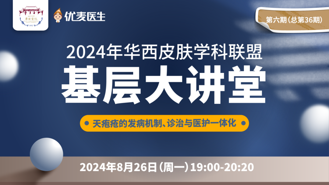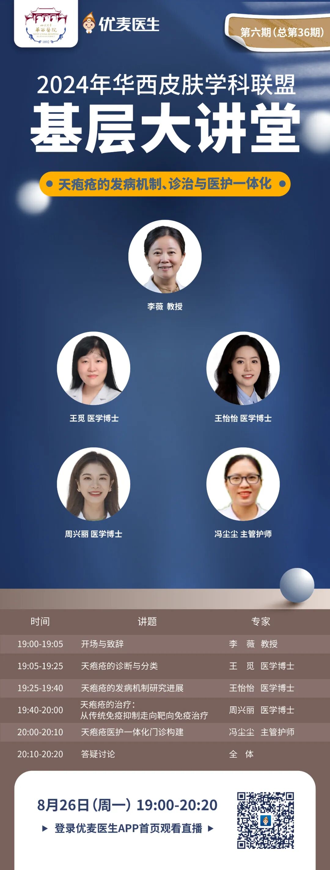 活动时间 2024年8月26日(周一)19:00-20:20 活动地点 请登录“优麦医生APP首页——最新直播”观看 活动详情 专家介绍 李薇 主任医师 博士研究生导师 四川大学华西医院罕见病中心专家,建立了华西医院大疱性皮肤病诊治体系,开设了华西医院银屑病MDT。 GRAPPA Dermatologist Membership Engagement Committee Co-chair; 中国康复医学会大疱病康复学组副组长; 中国中西医结合学会皮肤专委会银屑病学组副组长; 四川省医学会银屑病学组组长。 王觅 医学博士 四川大学华西临床医学院/华西医院讲师,医学博士。 发表文章6篇,第一作者4篇,SCI收录期刊文章2篇,第一作者和协作各1篇。 王怡怡 医学博士 四川大学华西医院皮肤科博士研究生,主要关注领域为免疫性皮肤病的发病机制及临床管理。 周兴丽 医学博士 四川大学华西临床医学院皮肤病与性病学医学博士,主要关注领域为大疱性皮肤病临床与基础研究。 冯尘尘 主管护师 硕士研究生 华西医院门诊部护士长,国际伤口/造口治疗师,主要关注领域为门诊管理、慢病管理、皮肤创面护理。 排版 | 小半 更多精彩,尽在新版优麦医生APP