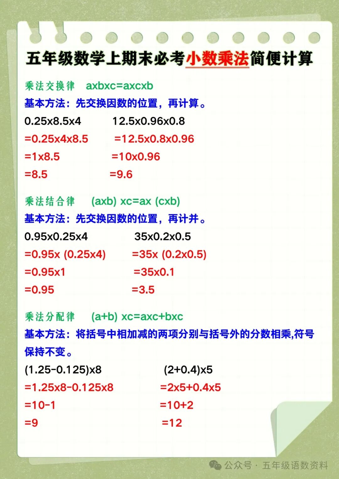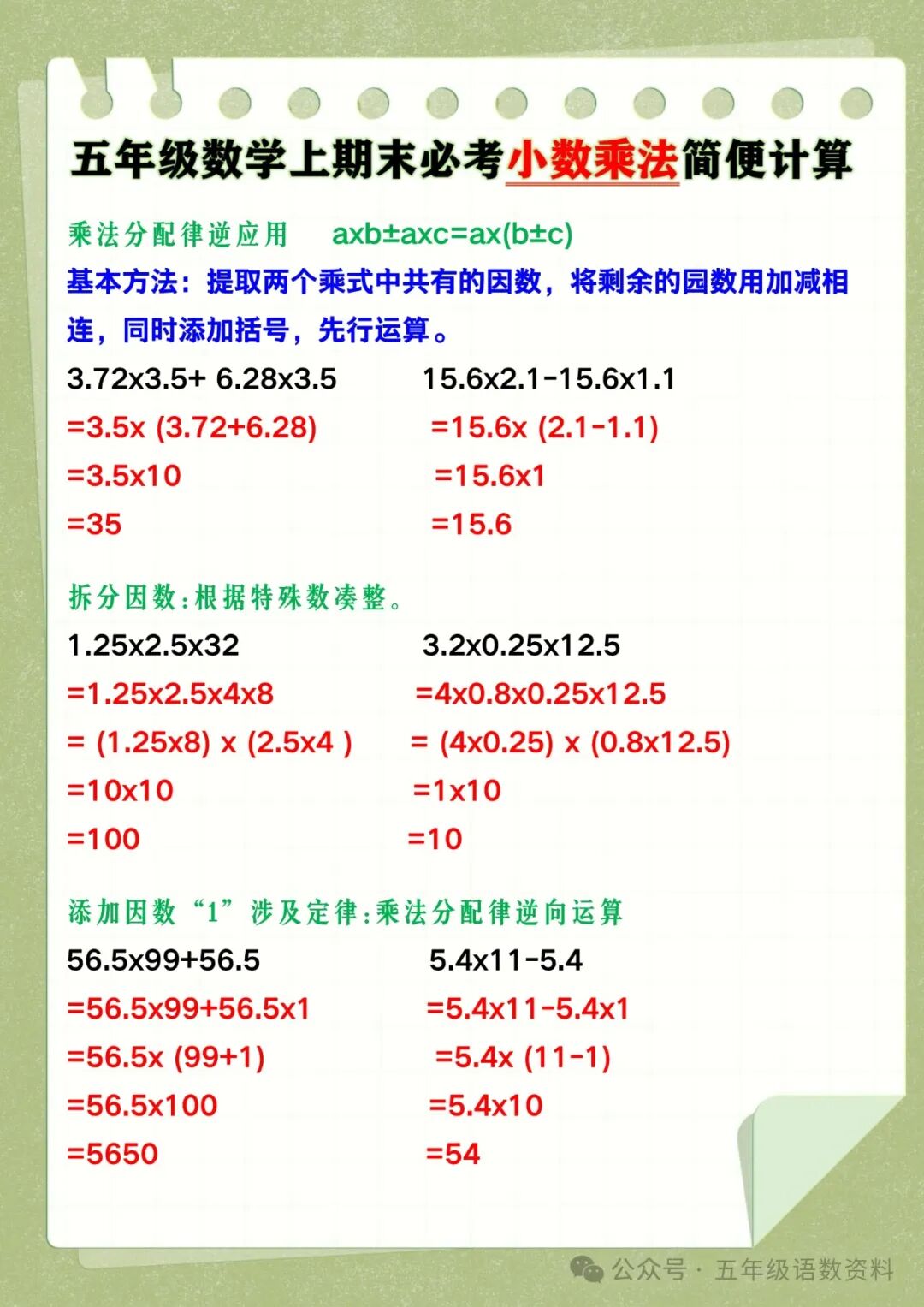 最近,后台不少家长学生询问学习资料,今天王老师准备了五年级数学上期末必考《小数乘法简便计算》6大类,孩子学习必备哦! 五年级数学上期末必考《小数乘法简便计算》6大类 五年级数学上期末必考小数乘法简便计算 乘法交换律 axbxc=axcxb 基本方法:先交换因数的位置,再计算。 0.25x8.5x4 12.5x0.96x0.8 =0.25x4x8.5 =12.5x0.8x0.96 =1x8.5 =10x0.96 =8.5 小数乘法简便运算 =9.6 乘法结合律 (axb) xc=ax (cxb) 基本方法:先交换因数的位置,再计并。 0.95x0.25x4 35x0.2x0.5 =0.95x (0.25x4) =35x (0.2x0.5) =0.95x1 =35x0.1 =0.95 =3.5 乘法分配律 (a+b) xc=axc+bxc 基本方法:将括号中相加减的两项分别与括号外的分数相乘,符号保持不变。 (1.25-0.125)x8 (2+0.4)x5 =1.25x8-0.125x8 =2x5+0.4x5 =10-1 =10+2 =9 =12 乘法分配律逆应用 axb±axc=ax(b±c) 基本方法:提取两个乘式中共有的因数,将剩余的园数用加减相连,同时添加括号,先行运算。 3.72x3.5+ 6.28x3.5 15.6x2.1-15.6x1.1 =3.5x (3.72+6.28) =15.6x (2.1-1.1) =3.5x10 =15.6x1 =35 =15.6 拆分因数:根据特殊数凑整。 1.25x2.5x32 3.2x0.25x12.5 =1.25x2.5x4x8 =4x0.8x0.25x12.5 = (1.25x8) x (2.5x4 ) = (4x0.25) x (0.8x12.5) =10x10 =1x10 =100 =10 添加因数“1”涉及定律:乘法分配律逆向运算 56.5x99+56.5 5.4x11-5.4 =56.5x99+56.5x1 =56.5x (99+1) =5.4x (11-1) 小数乘法简便运算 =56.5x100 =5.4x10 =5650 =54 小数乘法简便运算
