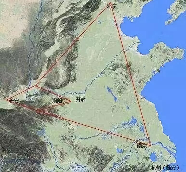 综上可见,从西周到唐代的两千年里,国都主要是在西安与洛阳之间徘徊搬迁;唐末到北宋的二百年间,是在洛阳与开封的徘徊时期。这两个时期,实质上是在东西横轴上的位置平移,纬度相差无几。