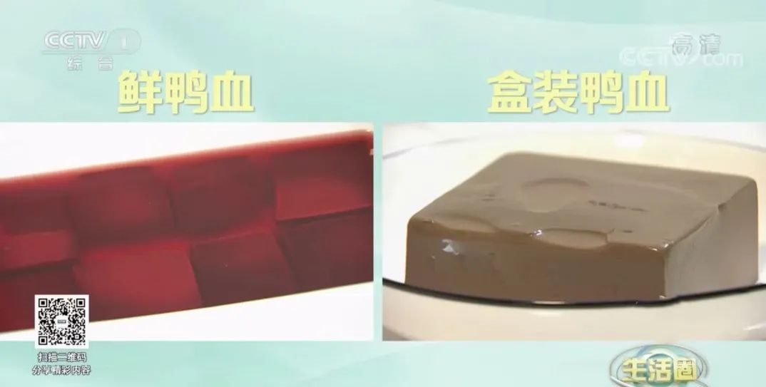 鲜鸭血由于在凝固后未经蒸煮工艺,所以颜色更为鲜艳,盒装鸭血因为经过蒸煮过程,所以颜色多为红棕色,口感更富有弹性。