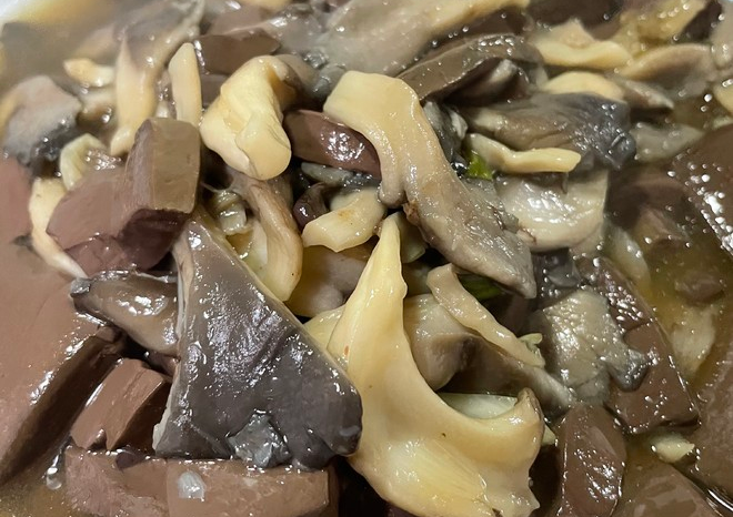 原料:鸭血、平菇,姜片、蒜末、葱段各少许