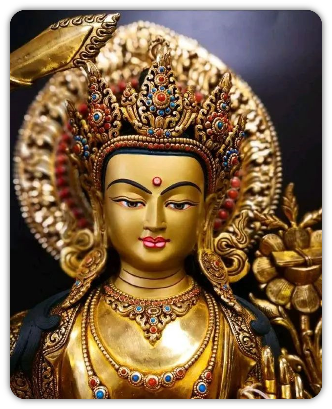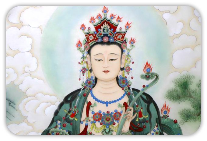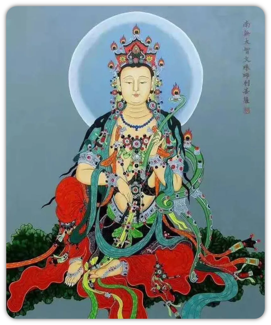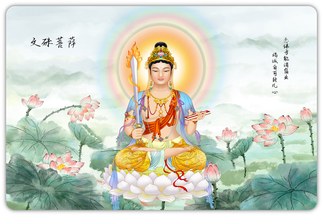 文殊是一切如来之智慧,又名智慧佛,与普贤菩萨成对为释迦牟尼佛之左右肋待,和释迦佛、普贤菩萨合称华严三圣。文殊师利译为「妙吉祥」,手中的所持物,右为智慧焰剑,左为莲华上之般若经典。象徽文殊智慧出如利剑,可摧毁愚痴,般若智慧浩瀚如经卷。修习文殊法,能开发俱生智,坚固记忆,令得聪明,了知诸法真实义,消除语业,破愚痴,得诸佛菩萨之般若智慧。