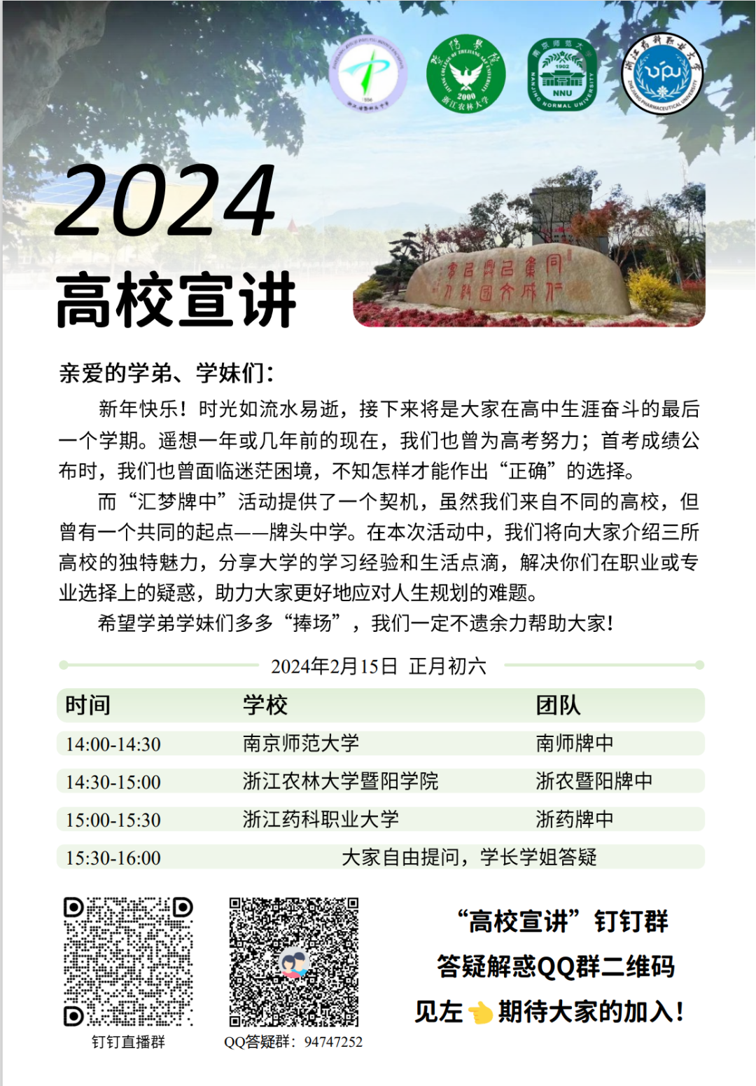 为进一步激励牌中学子,增加对高考和浙江药科职业大学的了解,助力做好学习生涯规划活动。元宵节前,浙江药科职业大学牌中宣讲队重返浙江省诸暨市牌头中学开展励志宣讲活动。