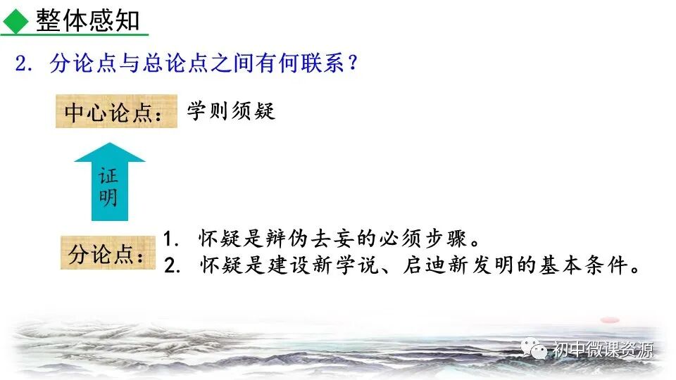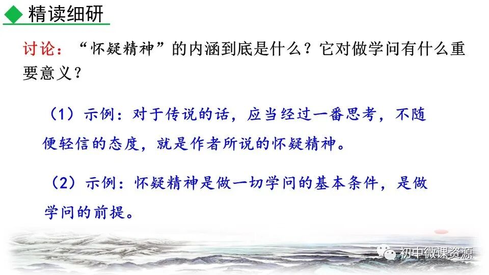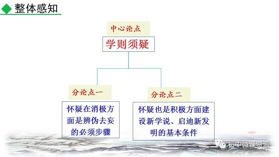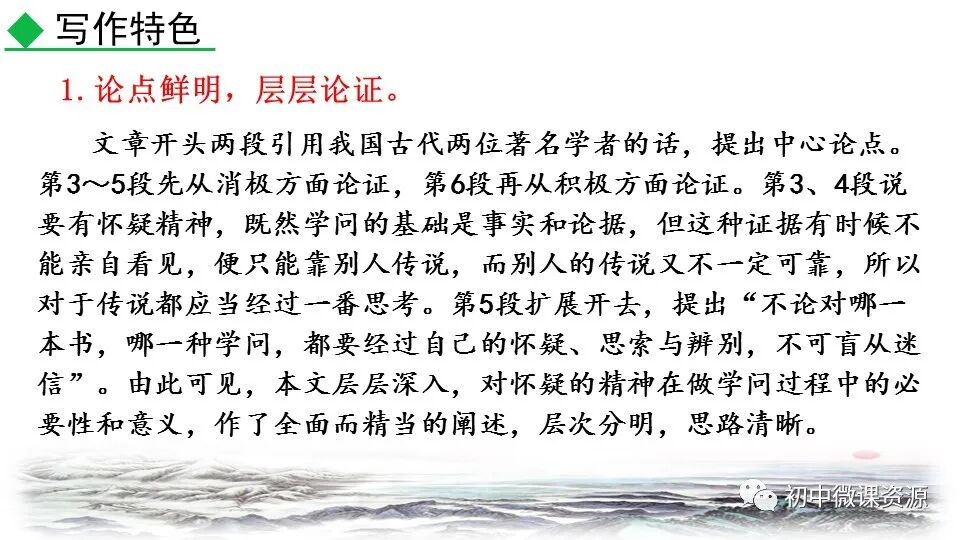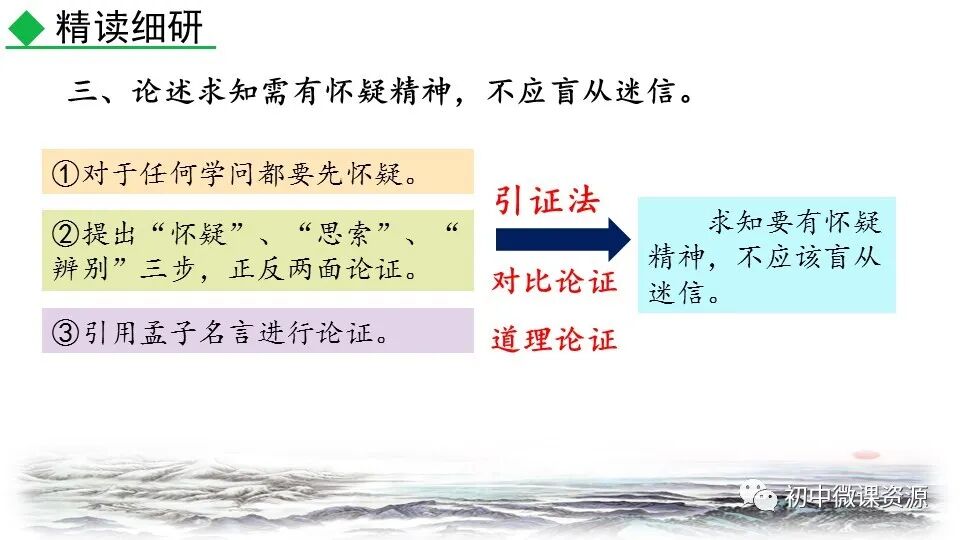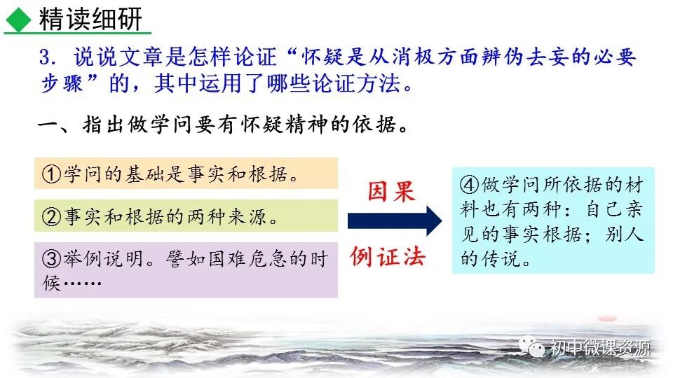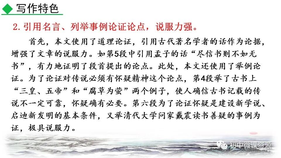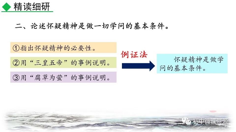 本题运用举例论证作 用分析法。作者列举“三 皇、五帝”和“腐草为萤”两个事例进行论证。论述 了人们怎样以怀疑的精神做学问,使 人确信古书记载的传说不一定可靠, 怀疑精神很有必要。