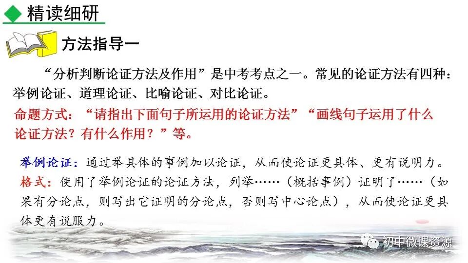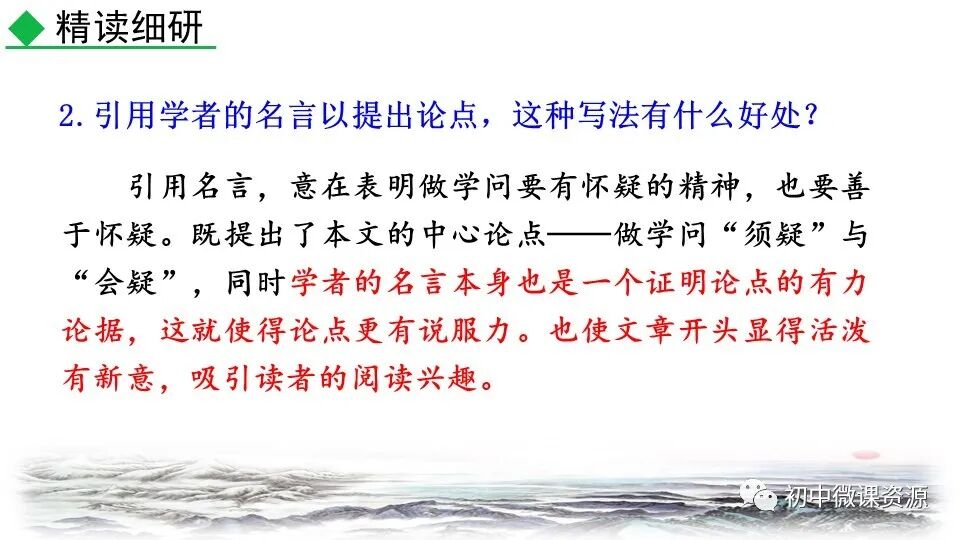 本题运用引用论证作用分析法。 运用了引用论证的方法。作者在开头 引用这两句名言,既提出了论点,同 时学者的名言也是一个证明论点的有 力证据,这使得论点的说服力增强。