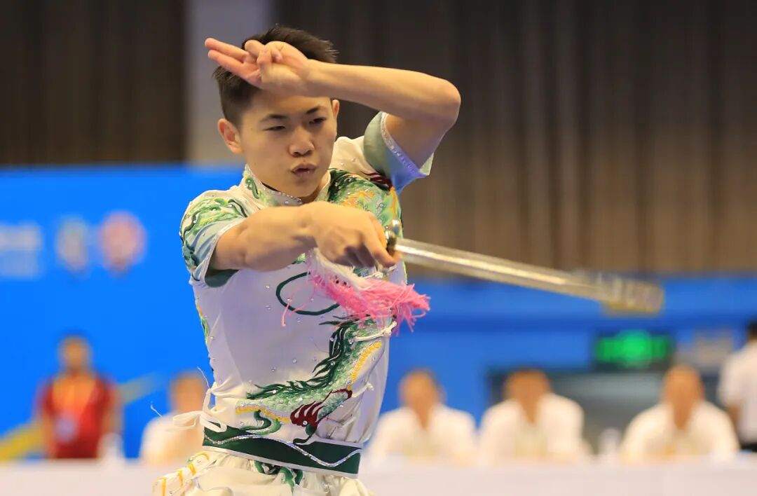 首届学青会(校园组)武术套路中学男子组自选剑术项目决赛中。