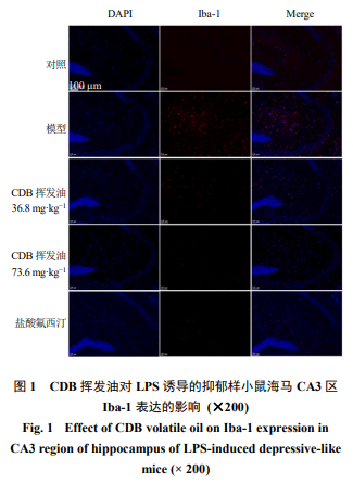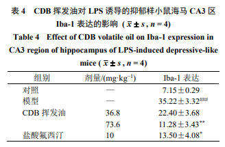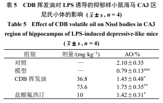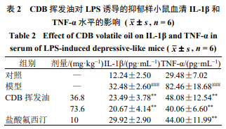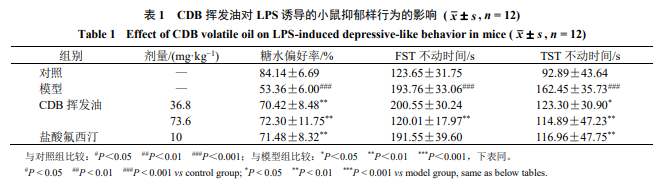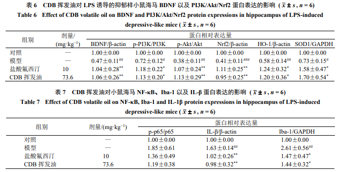 Plus 6.0软件选取相同的蓝色作为判断所有切片图像阳性的统一标准,方法同“2.6”项,计算AO值。2.8 Western blotting检测海马BDNF、PI3K/Akt/ Nrf2以及NF-κB通路相关蛋白表达称取小鼠海马组织20 mg,加入200 μL RIPA裂解液(RIPA∶蛋白酶抑制剂∶磷酸酶抑制剂=98∶1∶1)。低温匀浆后冰上裂解1 h,12 000×g离心15 min,取上清液,BCA法测定蛋白浓度,加入蛋白上样缓冲液制备海马组织样本。蛋白样品经十二烷基硫酸钠-聚丙烯酰胺凝胶电泳,转至PVDF膜,封闭后,4 ℃孵育对应的一抗过夜,第2天洗膜后孵育二抗,洗膜后在凝胶成像系统中成像,并通过Image Lab软件分析p-PI3K、PI3K、p-Akt、Akt、Nrf2、HO-1、SOD1、BDNF、p-p65、p65、IL-1β、Iba-1蛋白表达。使用SPSS 26.0统计软件分析数据,数据以表示,计量数据符合正态分布使用单因素方差分析(One-way ANOVA),非正态分布数据使用非参数检验分析。3.1 CDB挥发油对LPS诱导的抑郁样小鼠行为学的影响如表1所示,与对照组比较,模型组小鼠糖水偏好率明显降低(P<0.001),FST、TST的不动时间显著延长(P<0.001),表明ip