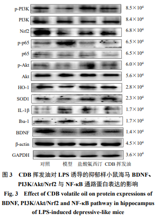 LPS可导致小鼠快感缺失和奖赏机制缺乏,绝望行为明显增加,使动物出现抑郁样行为表现。与模型组比较,各给药组小鼠糖水偏好率明显升高(P<0.01),TST不动时间显著缩短(P<0.05、0.01),CDB挥发油高剂量组FST不动时间显著缩短(P<0.01),表明CDB挥发油能改善动物抑郁样行为。3.2 CDB挥发油对LPS诱导的抑郁样小鼠血清炎症因子水平的影响如表2所示,与对照组比较,模型组小鼠血清IL-1β和TNF-α水平显著增加(P<0.001)。与模型组比较,CDB挥发油各剂量组小鼠血清中IL-1β、TNF-α水平显著降低(P<0.01),盐酸氟西汀组TNF-α水平显著降低(P<0.01)。3.3 CDB挥发油对LPS诱导的抑郁样小鼠海马组织氧化应激水平的影响如表3所示,与对照组比较,模型组小鼠海马MDA水平显著增加(P<0.01),GSH水平及SOD活性显著降低(P<0.05、0.01),提示LPS可诱导小鼠中枢呈现氧化应激表现。与模型组比较,CDB挥发油高剂量组和盐酸氟西汀组MDA水平显著降低(P<0.05),GSH水平及SOD活性均显著升高(P<0.05),提示CDB挥发油能抑制LPS诱导的氧化应激反应。3.4 CDB挥发油对LPS诱导的抑郁样小鼠海马CA3区小胶质细胞激活标志物Iba-1表达的影响如图1和表4所示,与对照组比较,模型组小鼠海马CA3区Iba-1表达显著增加(P<0.001),提示LPS可刺激中枢小胶质细胞激活,从而引起中枢神经炎症,进而致使小鼠的行为学异常。与模型组比较,CDB挥发油高剂量组和盐酸氟西汀组小鼠海马CA3区Iba-1表达显著下调(P<0.05、0.01),表明CDB挥发油能有效抑制LPS诱导的神经炎症。3.5 CDB挥发油对LPS诱导的抑郁样小鼠海马CA3区尼氏小体的影响如图2和表5所示,与对照组比较,模型组小鼠海马CA3区尼氏小体AO值显著降低(P<0.001),提示模型组小鼠海马CA3区神经元有损伤。与模型组比较,各给药组海马CA3区尼氏小体AO值均显著降低(P<0.05、0.01),表明CDB挥发油能够有效改善神经元损伤。3.6 CDB挥发油对LPS诱导的抑郁样小鼠海马BDNF、PI3K/Akt/Nrf2与NF-κB通路相关蛋白表达的影响 如图3和表6、7所示,与对照组比较,模型组小鼠海马组织BDNF蛋白表达水平显著降低(P<0.01),提示LPS诱导的小鼠抑郁症模型成功[20]。模型组小鼠海马组织p-PI3K/PI3K、p-Akt/Akt、Nrf2、HO-1和SOD1蛋白表达水平均明显降低(P<0.05、0.01、0.001),提示模型组小鼠PI3K/Akt/Nrf2通路被抑制,与氧化应激反应有关。模型组小鼠海马p-p65/p65有升高趋势,IL-1β和Iba-1蛋白表达水平显著升高(P<0.01),提示模型组小鼠出现神经炎症。与模型组比较,CDB挥发油高剂量组BDNF和PI3K/Akt/Nrf2通路相关蛋白表达显著上调(P<0.05、0.01),IL-1β和Iba-1蛋白表达水平均显著下调(P<0.05、0.01),提示CDB挥发油能通过调节PI3K/Akt/Nrf2信号通路发挥抗氧化作用并抑制神经炎症,从而达到抗抑郁样行为目的。