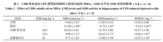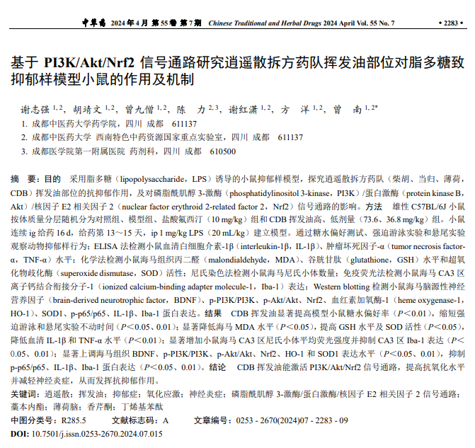 逍遥散记载于宋代《太平惠民和剂局方》,为疏肝解郁名方,课题组前期研究发现逍遥散的拆方药队柴胡、当归、薄荷(CDB)具有与全方相当的抗抑郁作用,其作用机制可能与影响5-羟色胺(5-hydroxytryptamine,5-HT)、脑源性神经营养因子(brain-derived neurotrophic factor,BDNF)水平有关[12-14],进一步研究发现CDB挥发油部位能通过激活核因子E2相关因子2(nuclear factor erythroid 2-related