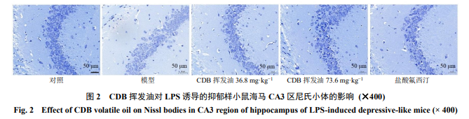 molecule-1,Iba-1)兔多克隆抗体(批号分别为82206、4060、4228、8242、47808、17198)均购自美国CST公司;IL-1β兔多克隆抗体(批号AF4006)购自Affinity公司;β-actin兔多克隆抗体(批号GB11001)、GAPDH兔多克隆抗体(批号GB11002)、HRP羊抗兔IgG二抗(批号GB23303)、HRP羊抗鼠IgG二抗(批号GB23301)均购自Servicebio公司;SOD1小鼠单克隆抗体(批号sc-271014)购自Santa Cruz Biotechnology公司。SYNS00000型纯水仪(Minipore公司);JCS型电子天平秤(英衡电器有限公司);Varioskan Flash全波长多功能酶标仪、Revos脱水机(美国Thermo Fisher Scientific公司);63024型悬尾测试箱、63022型强迫游泳筒、63036型灯箱(深圳市瑞沃德生命科技有限公司);JB-P5型包埋机、JB-L5型冻台(武汉俊杰电子有限公司);RM2016型病理切片机(上海徕卡仪器有限公司);KD-P型组织摊片机(浙江省金华市科迪仪器设备有限公司);Pannoramic SCAN Ⅱ型病理切片扫描仪(3DHISTECH Kft公司);DS-U3型成像系统(日本尼康公司);ChemiDoc免染型化学发光凝胶成像系统(美国Bio-Rad公司)。柴胡、当归、薄荷按配比称取适量装入烧瓶中[19],加入8倍量的水后,采用挥发油轻油提取器蒸馏6 h,提取过程中以锡箔纸遮住提取器刻度区避光,收集上层挥发油,无水硫酸钠除水,得到黄色油状液体,称定质量,计算得率为0.3%,保存于棕色瓶中,置?20 ℃冰箱备用。经GC-MS测定,CDB挥发油中藁本内酯、薄荷脑、香芹酮、丁烯基苯酞质量分数分别为45.89%、8.03%、4.60%、4.52%[15]。雄性C57BL/6J小鼠按体质量分层随机分为对照组、模型组、盐酸氟西汀(10 mg/kg)组和CDB挥发油高、低剂量(73.6、36.8 mg/kg)组,挥发油剂量设置按前期大鼠实验剂量换算而得[15]。CDB挥发油用3%聚山梨酯80与生理盐水配制。小鼠适应性喂养3 d后开始ig给药(20 mL/kg),对照组和模型组ig等体积3%聚山梨酯80与生理盐水,连续给药16 d。于给药第13~15天,除对照组外其余各组小鼠每日ip 1 mg/kg LPS(20 mL/kg)造模。造模后进行行为学测试,然后麻醉小鼠,眼眶取血分离血清,并在冰台上剖取小鼠全脑及海马组织。2.3.1 糖水偏好测试(sucrose preference test,SPT) 将小鼠单笼放置并禁食禁水24 h,准备1%糖水瓶和纯净水瓶并称定质量,每个笼子上放置1个纯净水瓶和1个糖水瓶,2 h交换2个水瓶的位置,以小鼠4 h内糖水偏好率作为评价指标。2.3.2 强迫游泳实验( forced
