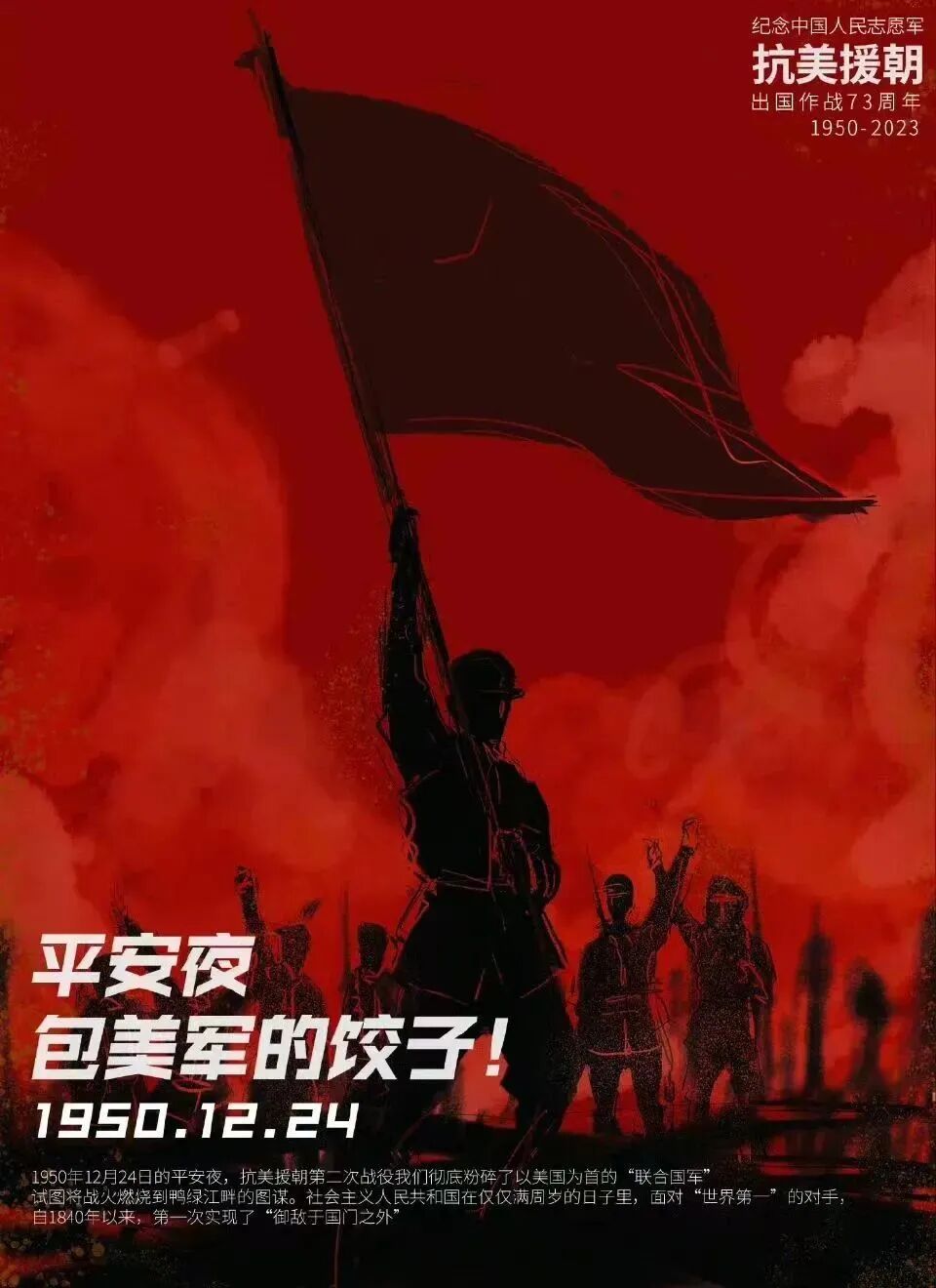 岂以祸福避趋之。 ——林则徐 中国没有什么“平安夜”,只有长津湖战役胜利的日子,今天是长津湖战役胜利的73周年!我们应该牢记这一点,而不是去过所谓的“平安夜”。 冰雪啊,我决不屈服于你!这句话是对73年前在朝作战的先烈们最真实的写照!在当时残酷的温度下,他们不畏风雪,不惧严寒,英勇作战,誓要将美国的狼子野心粉碎,誓要守护好祖国的大门! 当美军还在为伙食而感到不满时,殊不知,志愿军们连冻土豆都快吃不上了!由于双方的装备相差悬殊,美军的飞机轰炸补给线,导致食物供给不上,对于志愿军来说,冻土豆都快成为了一种奢求! 美军的坦克与志愿军的轻步枪的鲜明对比!在当时,美军不缺坦克和大炮,更有着飞机这一绝对的空中优势,而我们的志愿军不仅装备落后,而且还要防止美军的空中打击! 虽然我们志愿军的装备与物资等各个方面都不如美军,但我们还是胜利了。因为志愿军们顽强不屈的意志,他们不求物资装备能多好,他们只想守住祖国的大门,只想快点把这场仗打完,不让身为后辈的我们再有战争! 在73年前的今天,是长津湖战役的胜利。这场战役的胜利,让一直藐视我们的美帝国被彻底拍醒,让所谓的“联合国军”在战略上彻底的被打败,让我们认清,所谓的美帝国,只是一只被打败的纸老虎! 现在,我们还可以从《长津湖》这部影视作品去了解这段历史。当我们认为电影中的情节已经很悲惨的时候,我们更应该清楚,当年的长津湖战役的悲惨程度远不是这个电影能呈现出来的! 根本没有所谓的“平安夜”,我们现在的平安,是因为有人民子弟兵在,哪有什么岁月静好,只不过是有人替你在负重前行!因为他们的存在,我们的每一天才都可以被称之为“平安夜”! 监制:沈宏杰 统筹:赵攀科 素材提供:欧定让 赵奕帆 排版:苏展 审核:吴芬芬 投稿邮箱:hjsgxy@126.com 苟利国家生死以,