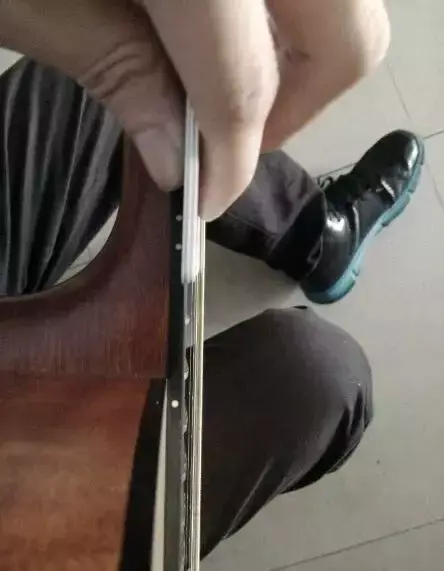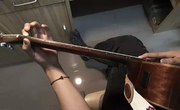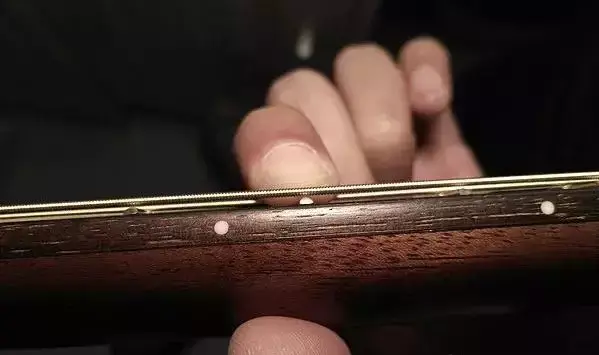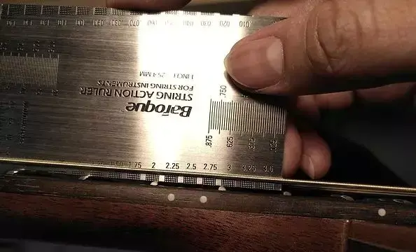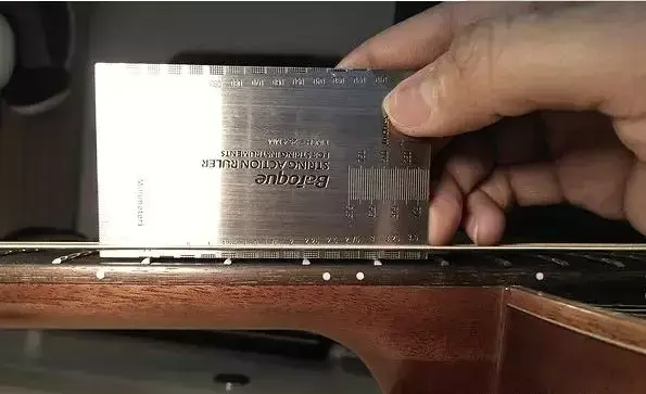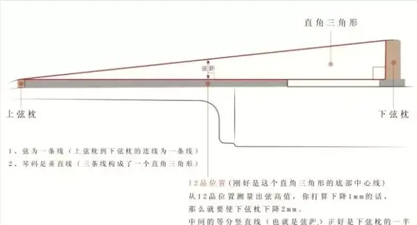 吉他弦距太低是不会造成基本功不扎实的。 我们把吉他弦距调低的目的就是为了左手更好地按好和弦,我本人更喜欢弹低弦距的吉他,平时玩指弹较多为了更好的演奏,所以调低了弦距。 像大神Tommy说到自己的吉他时:“我知道我的琴有些打品,但我不会让你听出来打品,也许它太低了,但很适合我。” 我们再来说说吉他弦距的高低有没有一个统一的标准? 每款吉他都有自己的出厂标准,但它们基本都在一个共识的范围内,这个范围总结出来如下,注意,它不是一个定死的刻度,而是一个范围: 木吉他: 6弦1品0.8mm,1弦1品0.55mm(2~5弦累积下去,用专业量尺测量) 6弦12品2.6mm,1弦12品2.2mm(这单板吉他的标准,合板的适当加高) 电吉他: 6弦1品0.65mm,1弦1品0.55mm(2~5弦累积下去,用专业量尺测量) 6弦17品2.0mm,1弦17品1.5mm(普通低档的吉他可以适当加高) 这是FENDER电吉他给出的弦高标准。 正确的测量方法是测量琴弦底部到品丝顶部,弦高尺与品丝90度垂直,眼睛平视。 对于木吉他而言,当琴颈处于理想状态下,在吉他12品处测量: 1、第1弦 2.0~2.5mm,第6弦 2.5~3.0mm,算是低弦距 琴颈曲度会引起弦高的变化,特别是当琴颈变形严重的情况下,先调弧度,再调弦高是最合理的方法。 一个简单实用的测弦距方法 对木吉他而言,普遍观点是12品处弦距2.5~3mm比较理想,想测测新买的吉他弦距是否正常,可身边没尺子,怎么办呢? 二代身份证和银行卡(无数字钢印凸起的)的尺寸,厚度分别为1mm和0.76mm,全国统一标准妥妥的。用身份证×1+银行卡×2=2.5mm测12品发现弦距略高于2.5mm,再加一张银行卡就把弦撑起来了。 材料:身份证,银行卡,身边有测量尺的童鞋们快测下新买的宝贝吧! DIY调整弦距的实践 说到调整弦距,那就先容我解释几个名词。 弦距:琴弦下沿至品丝上沿的间距。如果没有特意指明品数,一般是指12品的弦距。 弦距尺:淘宝大把有得卖,量弦距更方便的卡片形的尺子。没有的话一般尺子也能对付。 正确调整的琴颈应该在琴弦调至标准音时在拉力下有轻微的自然弯曲。过度的正负弧度以及绝对直都是错误的。一方面影响手感音准或导致打品,另一方面,琴颈可能因一个不正常的张力的长期作用导致不可恢复的变形,甚至开裂。 调节琴颈弧度 调节上弦枕高度 调节下弦枕高度 把步骤明确区分开的原因是,吉他的琴弦绷紧在上下弦枕上,悬在琴颈与琴桶上方。可以影响弦距高低的因素十分复杂。上弦枕高度、下弦枕高度、琴颈弧度、琴弦张力综合作用在琴弦上,任何一个变化都会导致不同的弦距。所以我们要尽量控制能控制的变量,然后逐层地调节,才能确保最后达到我们想要的效果。 如前文所说,琴颈应保持在一个中间略为下凹的弧度。如何确定琴颈的弧度呢?首先把琴弦调为标准音,按住 6 弦的 1 品,6 弦琴颈和琴桶相接往回数的那一品(一般是 14 品),如下图: 这样,1 品和 14 品间张紧的琴弦构成了一条可参考的水平线,通过琴弦与琴颈各个位置的间距就能看出琴颈的弧度。观察第 7 品(琴颈部分的中点)的弦距,合适的弦距大概是一张名片的厚度(不大于0.5 mm)。 如果这个距离过大,说明琴颈弧度过大(中间下凹),需要拧紧钢筋(眼睛正对螺孔,顺时针拧);如果这个距离过小,甚至没有距离,说明琴颈弧度不够,甚至为负(中间上凸),需要拧松钢筋(眼睛正对螺孔,逆时针拧)。拧的时候要少量多次,随调随观察避免过量。此外,扳手上可以缠上一些胶布,避免刮伤琴弦。需要注意的是,随着琴颈弯曲程度改变,弦上的张力也会变化。记得每次拧完钢筋都要把音重新调回标准音再观察。调节好的效果如下: 这样,在不改换不同张力的琴弦的情况下,除一段时间后琴颈发生了变形需要用钢筋进行补偿外,不需要再调节钢筋。 琴颈的弧度确定后调整上弦枕。需要先推算出要磨掉多少再进行具体操作。 测算要调整的高度 琴颈的弧度确定后我们需要找到一个能基本不受其他因素干扰的,衡量上弦枕高度的量,1品位置的弦距就很合适。它非常靠近琴头,即使下弦枕的高度后续还需要调整,对它的影响也非常有限。所以我们量一下6弦1品的弦距: 这个值控制在0.5mm 以内比较合适。如果大于0.5mm,计算出差异是多少。 打磨操作 从图中可以看见作者的琴这一项是OK的,所以上弦枕没有动。如果要调整的话,网上有一种方法是把弦枕上卡住6根弦的槽分别磨深。看似省事但个人不推荐这种做法。一方面6根弦分别磨,每根弦粗细又不一样,很可能导致磨过后各个弦高度不一致。另外比如1弦很细,如果磨时操作不得当,很可能不小心把槽拓宽或把弦枕边缘磨变形,影响音准。楼主曾经在旧琴上做过类似调整。先量出1品弦距并计算出与标准的差值,接着把上弦枕隔着布用钝物轻轻敲下来,从弦枕下面的平面标记并磨去差值部分更为稳妥。具体的磨法操作请参考后文的下弦枕部分。 接下来才是今天的重头戏。下弦枕会大幅影响弦距的高低,而且不得当的操作会改变音色。这部分操作要仔细,尽量追求精度。 测算要调整的高度 因下弦枕位置的原因,它的高度我们无法通过与它相邻的弦距确定。因此需要通过 12 品的弦距进行推算。我们先量出 12 品的弦距: 大概在2.5mm 与2.75mm 之间。理论上这个值在3mm 内就算合格。但要想要一个好的手感,不打品的前提下肯定是越低越好的。曾经见过一把琴调得很极限,12品几乎只有一张身份证的厚度。但也有一种说法是