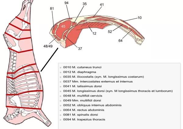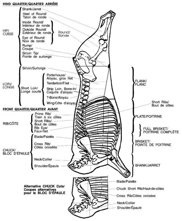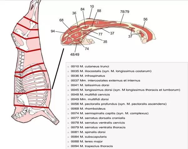 下面这张图是整头牛,按欧洲或美洲的分割法分出来的肉名,不用仔细去看。因为很多情况下,说胸啊、腹啊,哪怕是英文名,不同国家的分割法都不一样,最方便就是拿骨骼横剖面来说明。