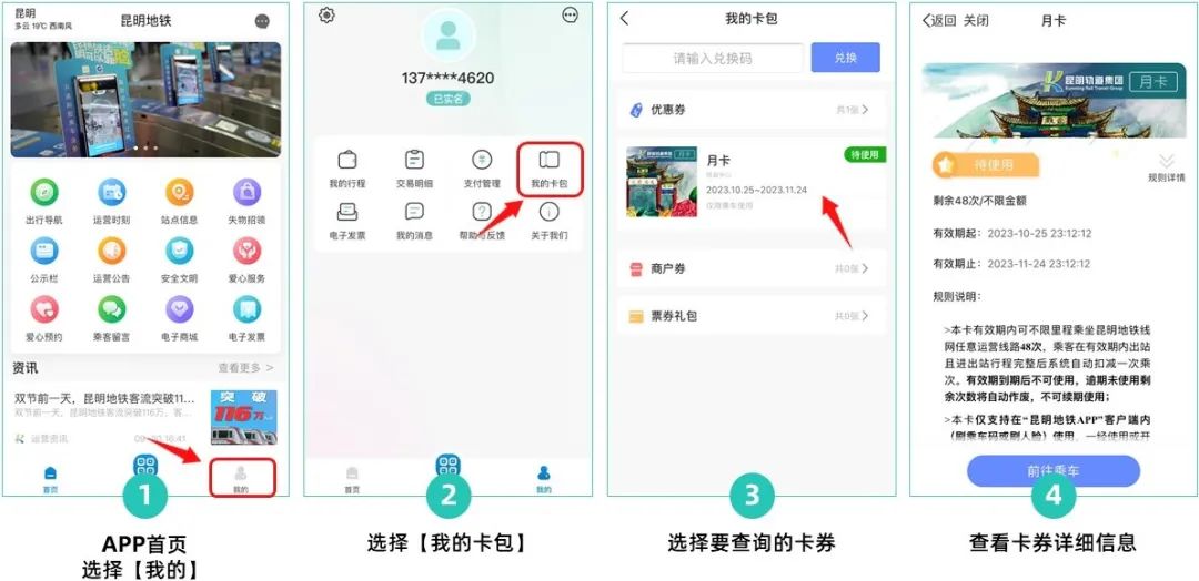 如乘客需要查询卡券的状态、有效期、剩余乘次以及使用规则等信息,可在我的卡包中查询,操作步骤如下。