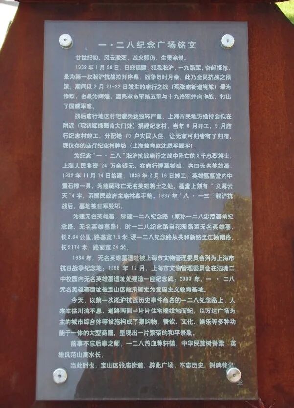 前事不忘,后事之师。一·二八热血荐轩辕,中华民族树脊梁,英雄风范山高水长。当此时也,宝山区张庙街道境内一二八纪念路北侧,辟此一·二八纪念广场,不忘历史,树碑铭记。