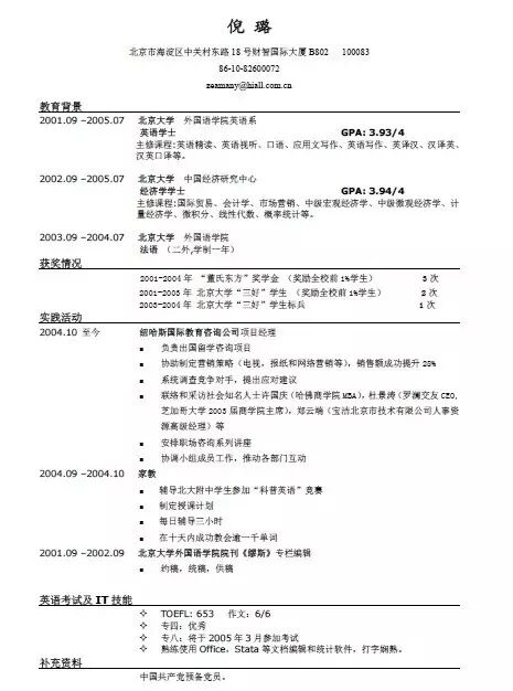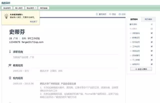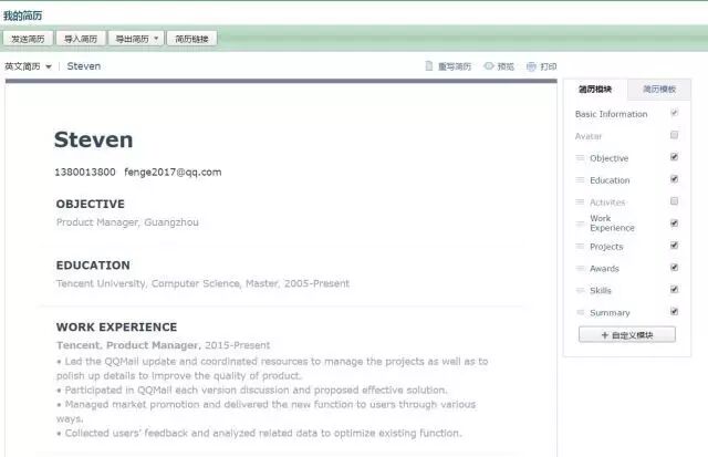 一说都找工作,大部分第一反应就是简历。 一想到写简历,第一步就是去百度搜各种简历模板。 但简历模板千变万化,挑来挑去,也不知道挑什么样的好。果然是人的认知和品味各不相同,各种奇葩的格式,居然也有人用。 我首先告诉大家,千万千万别用任何纯表格式的简历,如下面这种,真心low到爆。 qq邮箱模板 如果你的学历是大专及其以下,用这种格式没人会说你。 我没有学历歧视的意思,但是有一个很明显的规律是,低学历者如果初中、高中毕业、大中专生特别爱用这种,因为这种是最不用动脑筋的,把你会填的资料填齐就可以了。 如果是本科生了,还是别用这种了吧,只会给人一种低学历者的感觉。 但同时又有人走向另外一个极端,就是采用非常华丽、花里胡哨的简历模板。这种简历只能说明你把心思都花在表面的东西上了,而没有真正的货(设计工作除外)。 你们肯定会问我推荐哪种简历格式? 当然是简洁风格的最好,给人一种清爽、专业、自信的感觉。 那到底是哪种,能不能给个模板嘛? 就比如这种风格的。 我知道,就算是这种最简洁的格式,对于大多数自称精通word的求职者来说,还是做不出来。 肯定会有小伙伴说,能不能给个链接嘛,让我们直接下载。 我现在真不敢直接留链接了,因为薛定谔一样的百度网盘审核时不时封杀我的链接,说我侵权。 授人以鱼不如授人以渔。 我直接告诉大家,QQ邮箱内置的简历的功能,已经非常强大,只要把内容填进去,自动排好版,格式就是上面那种简约风格的,可以导出为PDF格式。 用电脑打开QQ邮箱,在文件中转站下面就有入口。 左上角会提示你可以从本地word里导入,省去了手动填写的麻烦。 在右边可以发现简历的各大模块,可以自定义选择哪些需要(比如个人照片就可以不要),切换到「简历模板」功能可以选择喜欢的模板,大部分模板都是简洁风格的,很符合当前求职市场需求,切记不要选表格式的。 点一下左上角,还支持英文简历。 点击左上角「发送简历」,会自动把当前内容生成PDF格式。