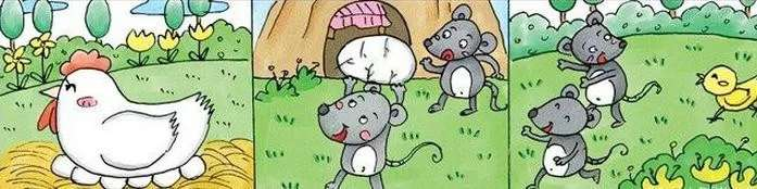就在这时,蛋壳裂开了,钻出来一只可爱的小鸡。老鼠们被吓坏了,放下小鸡扭头就跑,小鸡穷追不舍地紧跟身后叫着:“爸爸,妈妈等等我,等等我……”老鼠们急忙摆手说道:“我们不是你的爸爸妈妈,别跟着我们。”最后老鼠们魂飞魄散地逃走了。