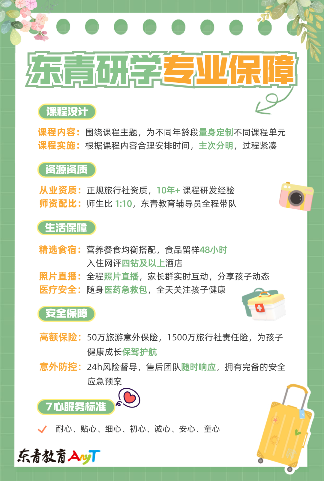 阳春三月,草长莺飞 正是春意正浓 万物蓬勃向上之时 相约三月植树季, 我们一起走进城市中央花园秘径, 同自然来一场约会, 手植春光,予世界一份美丽 1 小组约定 FVC 分小组,设立小组目标;竞选组长、观察员、记录员等角色。 2 建立花の档案 邀请同学到自然中观赏樱花、牡丹、绣球花等,并为花儿们建立花的字典。 3 植物贴画手作 收集飘落在地上好看的花朵或叶子,创意设计手作,再次绽放花的美丽。 4 趣味动物小游戏 走进萌宠乐园,动物互动;抽取身份卡牌,开展趣味动物小游戏。 5 嗨放森林乐园 挑战穿越丛林、探索无动力乐园、体验彩虹滑道等,创造七彩童年` 6 植物成长笔记 学习并动手体验盆栽种植方法,观察其成长形态,为植物编写成长日记。 相约三月 花海邂逅 探秘花海|盆栽种植|动物互动 自然探秘|爱护环境|责任意识 #1 问题导入 Problem import 花朵绿植对环境的意义? 探究国家设立植树节的目的是? 种植盆栽的注意事项?如何科学养殖植物? #2 目标收获 Target harvest 趣味互动,树立爱护自然的意识 走进大自然,观察花朵,编写花的百科档案;收集好看的植物,设计创意手作;与萌宠互动,开展趣味动物小游戏,考验孩子的思维和反应力;给予孩子与大自然交流的途径,增进与自然的关系,培养孩子保护环境,共同维护美丽家园的意识。 锻炼孩子的动手能力,学习科学种植 跟随老师学习种植的正确方法,了解种植盆栽的注意事项;观察植物个别不同时期的生长形态,动手种植,编写完整其成长笔记。 培养观察力、锻炼写作能力 观察植物成长过程的变化状况,将其生根、发芽、开花、结果等过程编写成笔记。观察性、探索性学习植物生长知识,培养孩子的观察力,锻炼其写作能力。 #3 活动内容 Activity content 组建队伍,全方位价值契约 植树节 分活动探究小组,竞选组内职务(小组长、观察者、探路者、记录员等角色)人人有职务。全方位价值契约 Full Value Contract,一起订立小组的共同目标和约定,赚去植树勋章。 赏三月繁花,编写花の档案 植树节 走进百花世界,近距离观察牡丹、樱花、百合花等不同的花的生长形态。 编写花的档案:通过走进花海,看一看,摸一摸,闻一闻,观察了解并记录花的生长环境、花瓣形状、颜色、大小、味道等信息,编写属于花的百科档案。 创意手作,植物贴画 植树节 收集散落在大自然美丽的花朵,用发现美的眼睛,探索自然色彩,创意设计植物贴画,再次将花儿的美丽绽放出来。 春日绚烂 萌宠互动,猜猜我是谁 植树节 走进萌宠乐园,和可爱的鸭子、羊、猪等互动,和动物友好相处,拉进与自然的距离。 每位成员,抽取动物身份卡牌,每人依次说出的卡牌动物的特征或形态或习性等,组员相互猜一猜组员所代表的动物身份,赢取植物勋章。 森林乐园,七彩童年 植树节 在充满自然的森林乐园中挑战丛林关卡、探索无动力乐园、体验彩虹滑道等趣味活动。 让孩子亲密地投入自然的怀抱,主动增加运动量,锻炼孩子的体能。 种植盆栽,成长笔记 植树节 引导孩子对种植的花卉进行观察,了解植物的不同形态,带领孩子动手种植盆栽。 将种植的植物带回家中,观察植物成长过程的变化状况,将其生根、发芽、开花、结果等过程编写成笔记。 观察性、探索性学习植物生长知识,培养孩子的观察力,锻炼其写作能力。 #4 活动流程 Event arrangement 08:00-08:30 在集合地点,集中签到 08:30-09:00 抵达营地 09:00-09:30 搭建队伍,全方位价值契约 Full Value Contract 09:30-10:30 赏三月繁花,编写花の档案 10:30-11:30 创意手作,植物贴画 11:30-12:30 用餐时间 12:30-13:30 萌宠互动,猜猜我是谁 13:30-15:00 森林乐园,七彩童年 15:00-16:00 种植盆栽,写成长笔记 16:00-16:30 总结分享,兑换植物勋章 16:30-17:00 返程 备注:活动顺序根据场地天气等因素以实际安排为准。 #5 报名信息 Registration information 【活动价格】298元/人 【活动日期】3月9日、17日、23日、31日,4月6日 【费用包含】门票、活动费、物料费、午餐、东莞青旅工作人员1名、保险、交通 【优惠政策】 (1)2人及以上同行优惠30元/人; (2)发朋友圈集满20赞优惠20元/人 【活动咨询】欢迎到青旅各大营业部咨询 *旅游爆发·诚邀加盟* *更多推荐* 图片来源:东青游、东青研学,版权归原作者所有,侵删