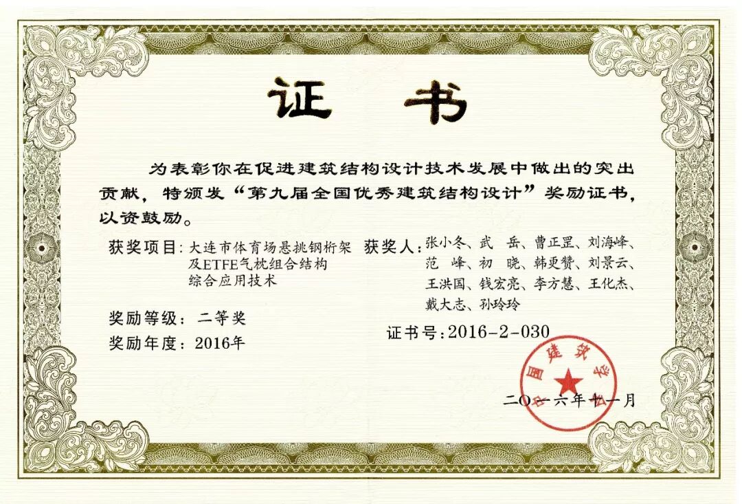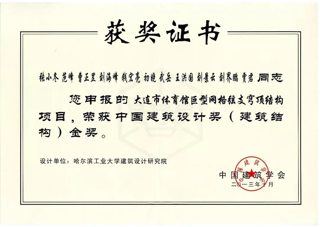 △大连市体育中心(体育场、体育馆、网球场、运动员训练基地)本项目曾获2016年中国建筑学会第九届全国优秀建筑结构设计二等奖、2017年度中国建筑学会建筑设计金奖、2013年中国建筑学会建筑结构设计金、2013年中国钢结构协会空间结构分会空间结构金奖、2013年第四届全国建筑结构技术交流会建筑结构技术创新二等奖。