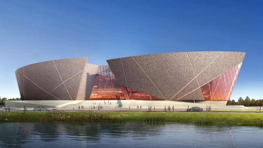 大庆市奥体中心由一场三馆组成。设计以水为基本元素,以水舞欢腾、盛世奇葩为理念,设计格调为:水于园中,园于维美,滨水而立,依水而生,水与建筑相辅相成。