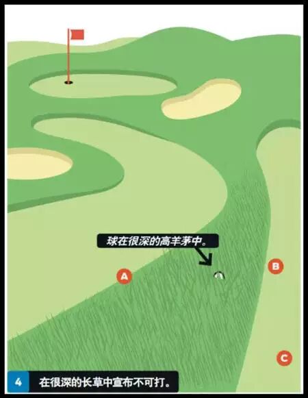 4. B点和C点。因为B点在球停点的2支球杆范围以内,并且没有靠近球洞。你不能在比球原来位置更靠近球洞的地方抛球,就此可以排除A点。C点也是可以的,因为它在球洞和球原来位置的连线上,而且没有比原来球的位置更靠近球洞。