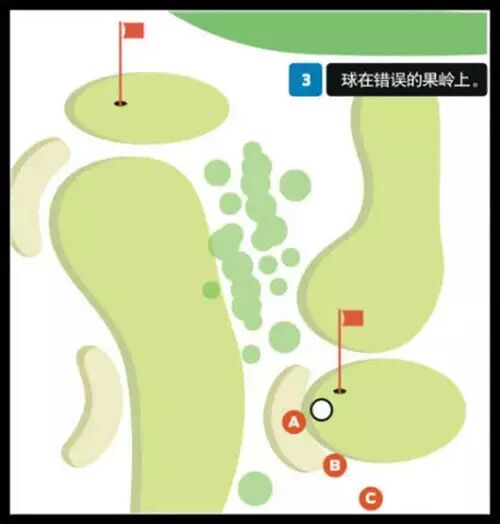 3. B点。当你的球位于错误的果岭上时,需要在最近补救点1支球杆范围内,不在障碍区中(A点位于沙坑以内)也不在果岭上抛球。因此B点,而并非C点,是最近的补救点。
