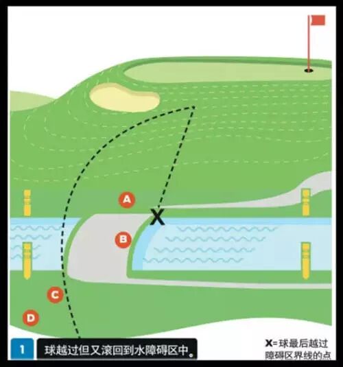 例如,球进入水障碍区、宣布不可打等,都是罚1杆后,在最后入水点或初始球位的“两杆范围”、不更靠近球洞处抛球;挥杆或站位受到球车道妨碍、球进入“临时积水区”等,都是免罚杆,在最近补救点的“一杆范围”、不更靠近球洞处抛球抛球。