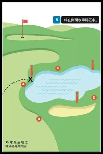 5. A、B和C点。A点可以是因为它位于球最后越过侧面水障碍区(由红色画线或立桩标定)的点2支球杆范围以内,并且位于障碍区界线以外、不更靠近球洞。B点可以是因为它位于球洞与最后入水点的连线上,并且在远离球洞的方向上、障碍区的后方。C点可以是因为它位于最后入水点在侧面水障碍区对岸与球洞等距离的点上,而D点并不满足此条件。