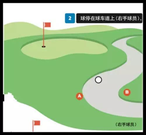 2. A点。那一点对于右手球员来说是最近补救点,球位于此点时球员的站位和挥杆都不会受球车道的妨碍,并且也没有更靠近球洞。对于左手球员而言,很有可能要把球抛在球车道的另外一侧。