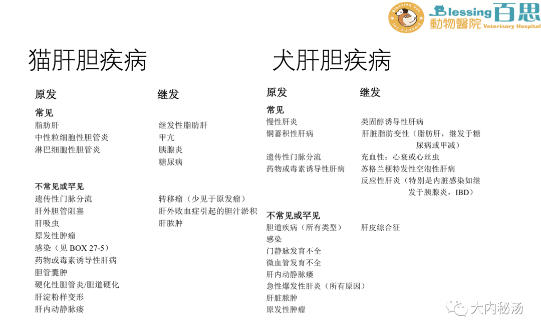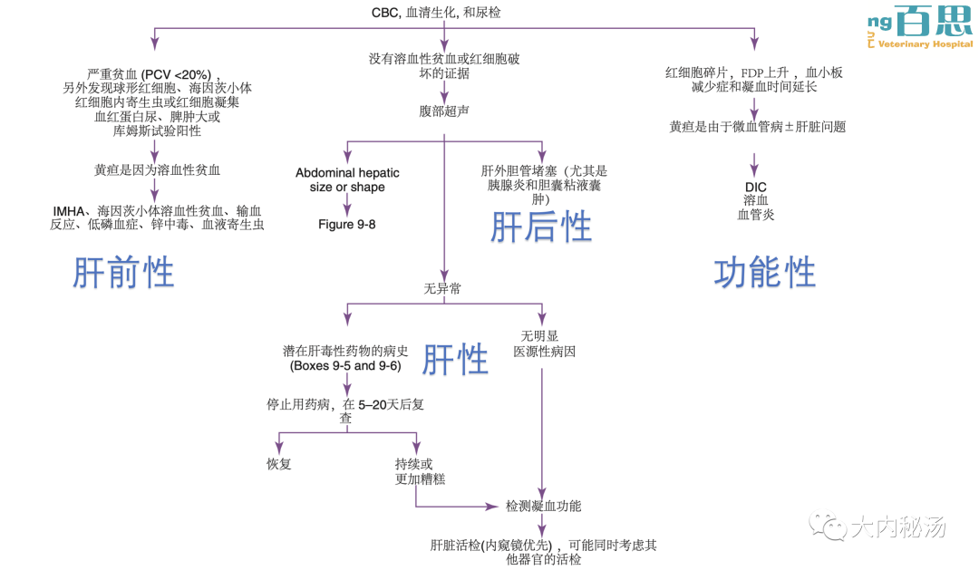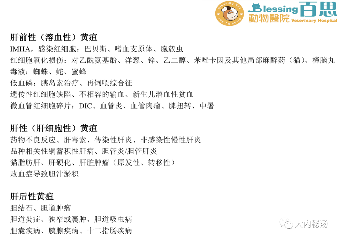 点击顶部蓝字|关注VETLAND 每日分享兽医知识、最新资讯、精彩译文 犬猫黄疸 01 定义/概述 Definition / Overview 黄疸,是继发于胆红素(高胆红素血症)增加而出现的粘膜、皮肤和巩膜变黄。血清胆红素水平必须超过约2mg/dl,才能在临床中观察到黄疸。 02 病因/病生理学 Etiology 病因学 ? 胆红素是含血红素分子的降解产物,例如血红蛋白(主要)、肌红蛋白和P450细胞色素酶。 ? 在红细胞衰老过程中,骨髓、脾脏和肝脏网状内皮系统的巨噬细胞将血红蛋白分解为血红素和球蛋白。然后血红素降解为胆绿素和铁。胆绿素(绿色素)随后被胆红素还原酶转化为胆红素(黄色素)。这种未结合胆红素与白蛋白结合并运送至肝脏,在那里它与葡萄糖酸结合并排泄到胆汁中。结合胆红素储存在胆囊,然后通过总胆管分泌到小肠。在结肠中,胆红素被肠绒毛代谢成尿胆原,最后氧化成粪胆素,使粪便呈现出特有的棕色。 ? 尽管超过80%的尿胆原通过粪便排出,但10-20%的尿胆原通过肠-肝循环重新吸收。此外,大约5%的重吸收尿胆原通过肾脏排出。 ? 当胆红素产生超过肝胆系统清除能力时,就会发生高胆红素血症。由于黄疸是高胆红素血症的一种特殊后果,其原因通常根据胆红素积累的步骤来分类:肝前性(溶血)、肝性(胆红素结合和胆道排泄减少)或肝后性(胆汁排泄减少)。 受影响系统 ? 心血管疾病——在肝前性黄疸(溶血)的病例中,携氧能力下降导致呼吸和心率增加。此外,从中度到重度贫血的血液粘度降低可引起生理性心杂音。 ? 神经系统——严重肝功能不全引起的黄疸,神经毒素(氨)的肝解毒作用受影响,导致多种神经症状,如抑郁、恶心、失明和癫痫发作(肝性脑病)。 ? 眼科-巩膜中胆红素沉积将导致其外观从白色变为浅黄色。 ? 肾脏/泌尿系统 - 胆红素代谢增加间接导致肾脏胆红素排泄增加,导致尿液黄褐色(胆红素尿症)。在黄疸的血清中,当血清胆红素水平超过30mg / dL时,引起色素性肾病导致急性肾损伤。 ? 皮肤-皮下组织中胆红素沉积导致皮肤变黄。 03 病征/病史 Symptoms / Medical History ? 由于黄疸有很多原因,所以没有特定的品种、性别或年龄偏好。 ? 肝前性黄疸——已知英国猎犬和美国可卡犬的磷酸果糖激酶基因错义突变导致酶缺乏,导致严重溶血;贝吉生犬、西高地白梗、阿比西尼亚猫和索马里猫的丙酮酸激酶的表达异常,导致溶血。 ? 肝性黄疸——贝灵顿犬、杜宾犬、拉布拉多犬和斑点狗易患铜性肝病。 ? 肝后性黄疸——喜乐蒂牧羊犬、迷你雪纳瑞犬和可卡犬易患胆囊粘液囊肿。 (百思汤永豪医生病例) 风险因素 ① 肝前性黄疸 某些犬种(斗牛犬和斯塔福梗)因感染巴贝斯虫而溶血的风险增加。 锌的摄入,主要是通过摄入1982年后铸造的硬币,可引起溶血性贫血。 ② 肝性黄疸 未接种疫苗的幼犬(传染性犬肝炎) 肥胖厌食的猫(脂肪肝)。 饲养在猫舍的纯种幼猫(猫传染性腹膜炎(FIP))。 接触毒素/药物——主动接触(布洛芬、地西泮、对乙酰氨基酚)或非自愿接触(毒蘑菇、蓝藻、西米棕植物、木糖醇、黄曲霉毒素),导致急性肝功能衰竭。 ③ 肝后性黄疸 库兴和甲减患犬患胆囊粘液囊肿的风险增加。 锌的摄入,主要是通过摄入1982年后铸造的硬币,也可导致继发性肝外胆道梗阻的胰腺炎。 病史发现 宠物主人通常发现深色尿液(有时会与血尿混淆)。在严重肝后性黄疸时,主人可能会发现浅灰色大便(无结石)。 当黄疸是继发于溶血时,主人可能会提到最近出现粘膜苍白。 对于肝性黄疸,主人可能会提到急性或慢性肝病的临床症状,如精神状态改变、异常出血、黑便、多尿和多饮,或腹胀。 不管黄疸的原因是什么,主人可能会提及一些非特异临床症状,如嗜睡、虚弱、厌食或呕吐。 应仔细询问主人是否可能接触肝毒素。 04 临床特征 Clinical features 宠物主人通常发现深色尿液(有时会与血尿混淆)。在严重肝后性黄疸时,主人可能会发现浅灰色大便(无结石)。 当黄疸是继发于溶血时,主人可能会提到最近出现粘膜苍白。 不管黄疸的原因是什么,主人可能会提及一些非特异临床症状,如嗜睡、虚弱、厌食或呕吐。 应仔细询问主人是否可能接触肝毒素。 05 鉴别诊断 Differential diagnosis 肝前性黄疸 通过贫血伴球形红细胞增多、自体凝集或Coombs试验阳性来诊断免疫介导性溶血性贫血 溶血性贫血的感染原因(巴贝斯、支原体血、猫肝簇虫)有时可通过显微镜诊断;但更建议进行PCR检测,因为其敏感性更高。 应根据完整病史和腹部X线片排除氧化损伤的原因,排除含锌的金属异物的存在。 如果在血涂片上发现了裂红细胞,则应怀疑微血管病,并应立即寻找血管肉瘤、腔静脉综合征、脾肿大或弥散性血管内凝血(DIC)。 接受胰岛素治疗的糖尿病酮症酸中毒(DKA)和长期厌食的动物患溶血性贫血(继发于严重低磷血症)的风险增加。 易感品种应考虑遗传性红细胞缺陷。 肝性黄疸 感染性原因(细菌性胆管炎,钩端螺旋体病,弓形虫病,败血症)应进行血清学检查以及胆汁/或血液培养; 肝活检需要排除肝硬化,铜蓄积性肝病,FIP或慢性肝炎; ALP增加而γ-谷氨酰转移酶(GGT)没有同时增加应怀疑脂肪肝。 肝后性黄疸 腹部影像学可鉴别胰腺炎、胆囊粘液囊肿、肿瘤(胰腺、胆道或十二指肠)或胆石症。在胆囊区域发现腹部游离液可能提示低蛋白血症。 (黄疸的各种具体原因) 06 诊断 Diagnosis CBC/生化检查/尿液分析 ?? CBC-溶血时,出