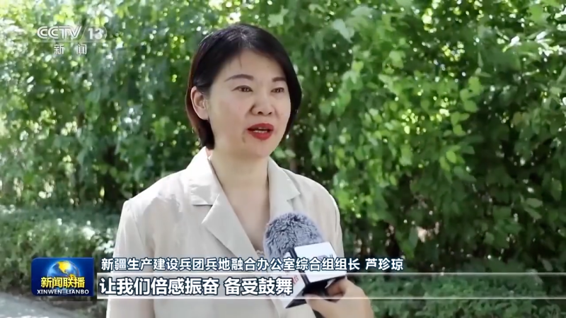 新疆生产建设兵团兵地融合办公室综合组组长 芦珍琼:习近平总书记关心新疆和兵团的发展,让我们倍感振奋,备受鼓舞。下一步我们要实施一批兵地共建公路铁路等重大交通基础设施建设,加强生态环境联防联控,推动纺织服装、现代化工等产业延链、补链、强链,促进各族群众交流交往交融,实现新疆长治久安。习近平总书记强调,做好新疆工作,关键是要坚持党的全面领导,切实加强党的建设。新疆扎实开展学习贯彻习近平新时代中国特色社会主义思想主题教育,目前相关单位开展调研3180次,解决问题困难1700多个,2200多件群众反映强烈的实事已全面落实。主题教育的成果正不断转化成为新疆各族干部群众干事创业的强大动力。