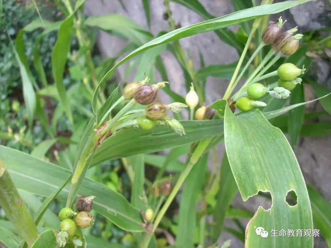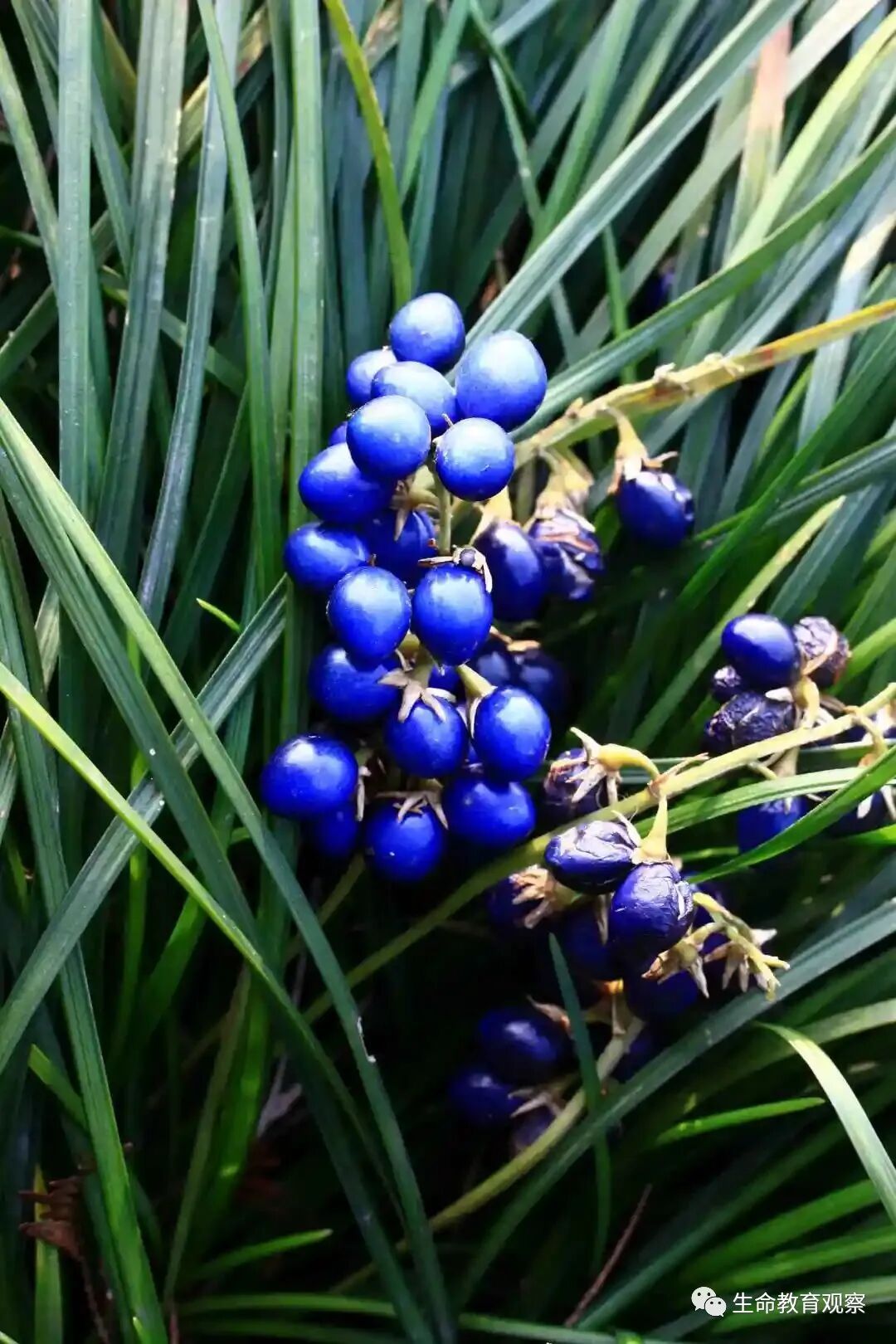 麦冬草的果实,呈非常漂亮且独特的亮蓝色,除去外面的一层肉质皮,里面是白色略透明的硬硬的东西,小时候经常把麦冬子当做“子弹”来玩耍。