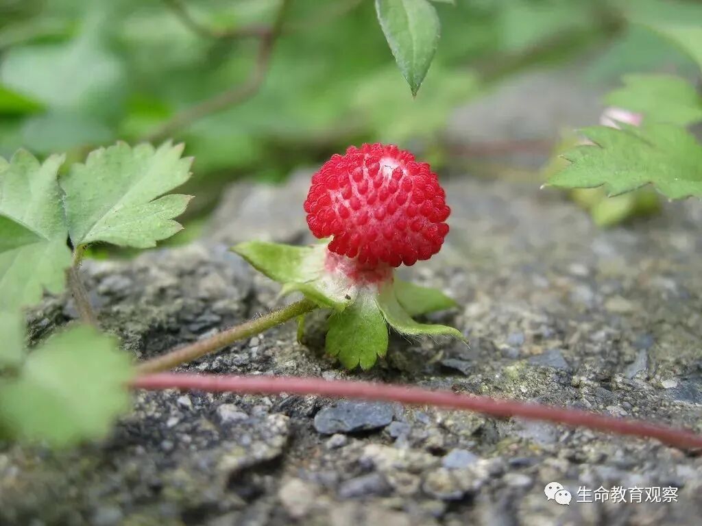 学名蛇莓,外形小小的圆圆的,上面有红色小颗粒,小时候常把它的小颗粒一粒粒弄掉,剩下里面粉色(近肉色)的果肉,软绵绵的。