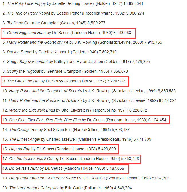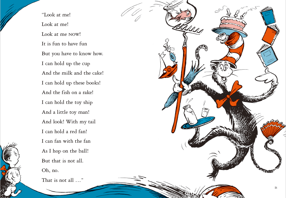 “他是一位罕见而疯狂的天才” 兰登书屋前总裁贝内特·塞弗说过:“我出版过无数大作家的作品,其中包括威廉·福克纳和亨利·奥哈拉,但是在我的作者名录里只有一个天才人物,那就是苏斯博士。” “他是一位罕见而疯狂的天才……我看不出有什么能阻止他成为我们这个时代的格林!” 这是苏斯博士的大学同学莱恩对他的评价。 苏斯博士(Dr. Seuss) (1904年3月2日—1991年9月24日) 在英语世界里,“苏斯博士”是一个家喻户晓的名字,不仅因为他创作的童书很受欢迎(在2001年《出版人周刊》统计的受欢迎童书排行榜前100名中,苏斯博士的作品上榜16种,其中前20名中就占了6种),还因为他的书很受英语教师的青睐,广泛应用于英语母语教学和外语教学中。3月2日是苏斯博士的生日,让我们一起来回顾一下苏斯博士的作品和他的一生。 他在二十世纪五六十年代创作的如《戴高帽子的猫》《绿鸡蛋和火腿》《一条鱼 两条鱼 红色鱼 蓝色鱼》《在爸爸身上跳呀跳》等这一类有点疯疯癫癫的韵文图画书,完全颠覆了雄霸英语教辅市场三十多年的“迪克与简”系列,引发了英语入门学习的一场革命。1965年“迪克与简”正式“退休”,苏斯博士对此负有不可推卸的责任。他得意地说:“我为将‘迪克和简’挤出大多数学校图书馆而感到自豪,那是我最大的满足。” 童书作家兼画家只是苏斯博士众多身份中的一个,他还曾经是一位广告设计师、动画师、动画导演、漫画家、剧作家、短篇小说家、纪录片制片人、作词家、教师,而且还是一位非常成功的童书编辑、出版人。在第二次世界大战期间他申请入伍,从事宣传工作,颇有贡献,退役时已晋升中校。他的人生丰富多彩,而他对人生与世界的思考常常渗透在他那些看似荒诞搞笑的作品中,而且以独特的方式影响着这个世界。 苏斯博士原名西奥多·盖塞尔,1904年出生于美国马萨诸塞州的斯普林菲尔德。但他的家庭是德国移民,祖籍在巴伐利亚地区。他童年的前半部分非常幸福,祖父是啤酒商,外祖父是面包店老板,父母双方的家庭都很富足,在当地德国移民社区很有声望。他父亲是当地最厉害的枪手,即将继承祖父的产业,也积极参与当地的公共事业,负责经管当地的动物园。 童年时期的苏斯博士 西奥多小时候常跟姐姐玛尼一起去动物园玩儿,回家就在墙上画各种古怪的动物,还混用德语和英语词汇自创古怪的名称逗乐,妈妈和姐姐都很喜欢。尤其是妈妈,一方面通过亲子阅读给了他很好的文学启蒙,另一方面对他在绘画方面漫无边际的想象能力感到非常骄傲。特别强调务实的爸爸尽管不太欣赏他的“胡编乱造”,但常常带他去户外活动,也给他创造了很好的物质条件。 美好的童年似乎在1917年戛然而止,随着美国对德国宣战,当地的德国移民家庭成了被仇视的对象,西奥多放学路上时常被辱骂、被扔石头、被追打,他们家地位的一落千丈延续到第一次世界大战之后。而1920年的禁酒令又给盖塞尔家的啤酒产业带来了毁灭性的打击,刚刚接手家族产业的父亲从此一蹶不振。 少年时体验过这种强烈落差和歧视的他变得非常敏感,他将自己的激情与才华投向讽刺艺术,可以很夸张,很搞笑,也可以很犀利,很辛辣。1921 年,苏斯博士和其他 16 名斯普林菲尔德中央高中的毕业生乘火车前往达特茅斯。他们的英语老师Edwin Red Smith是达特茅斯学院的新毕业生,他以充满活力的风格和和蔼可亲的方式,将这些学生集合在一起。 苏斯博士在达特茅斯学院四年时间中的亮点是成为学院幽默杂志The Jack-O-Lantern 的撰稿人和编辑。在他读大四那年的四月发生了一场骚乱,他和十几个朋友在他的房间里分享杜松子酒——那时正是禁酒令时期,作为惩罚,苏斯博士被免去编辑的职务。他很沮丧,但没有被吓倒。1925年春季版杂志上刊登了几位新艺术家的漫画,苏斯博士用母亲的姓氏“苏斯”作为笔名继续发表文章,他蒙混过关,没有被校长发现,这个笔名一直沿用到后来的童书创作中。 “苏斯博士”真的是博士吗?不是,也是。苏斯博士在1925年从达特茅斯学院毕业后,曾赴牛津大学攻读英语文学博士学位,但一年多后就放弃了,所以,他并没有真的拿到博士学位。不过,他在那里收获了爱情。在一次深奥而枯燥的文学课堂上,他聚精会神地在笔记本上写写画画的状态引起了女同学海伦的注意,那位来自著名的威尔斯利女子学院的学霸在牛津差不多就要完成学业了。海伦发现这位同学并没有做文学笔记,而是在本子上画一只长着翅膀的奶牛,差点当场笑出声来。课后,他们相谈甚欢,渐渐发展成情侣,几个月后决定一起回国结婚。 正是这位海伦,认定苏斯博士更适合通过发展其绘画和讽刺幽默方面的才能来追求自己的事业,为了支持苏斯博士,她放弃了自己的学业,在婚后一段时间主要靠她从事英语教师和杂志编辑的工作来获得相对稳定的家庭收入。1927年回到美国后,苏斯博士先是为报刊画漫画,做广告设计也有过相当丰厚的收入,但他最终决定转向创作童书,并在笔名上给自己加上一个“博士”头衔,苏斯博士因此得名。而从1937年的第一本书开始直到1954年,他的所有童书基本上都是与海伦合作的结晶,海伦是他最严格的文学编辑。 不过这个博士又不完全是假的。在苏斯博士的童书大获成功之后,为了表彰他对社会做出的巨大贡献,包括普林斯顿大学和他的母校达特茅斯学院