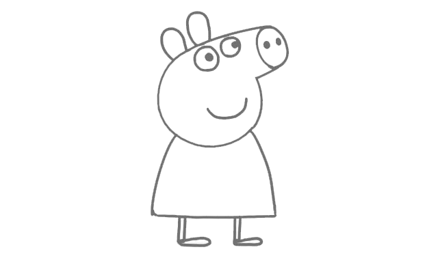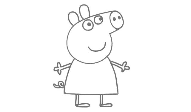 动画片里的佩奇总是微笑着的,给佩奇画上微微上扬的嘴巴。小佩奇喜欢穿裙子,我们再给佩奇画上美美的裙子,裙子下面是腿和脚,佩奇是个爱美的女孩,我们给佩奇的腿画细一点。
