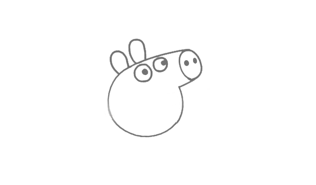 在头部上方画上佩奇的耳朵,两只耳朵竖起来。接着再画两个圈圈,圈圈中间再画两个更小的实心圈圈,做小猪的眼睛,在鼻头上画两个实心的圈圈做小猪的鼻孔。