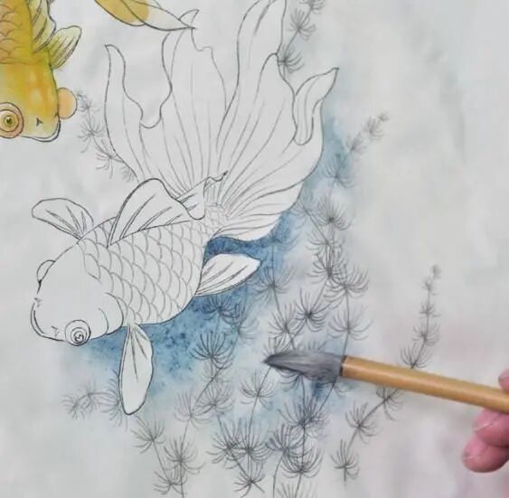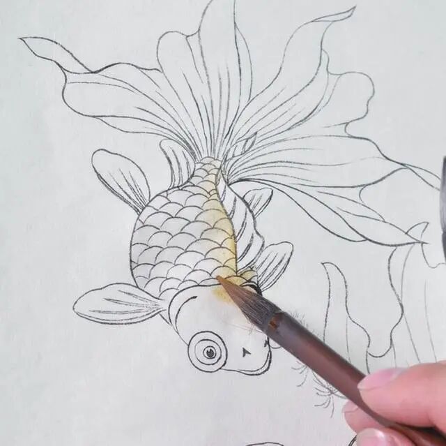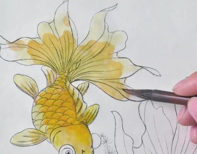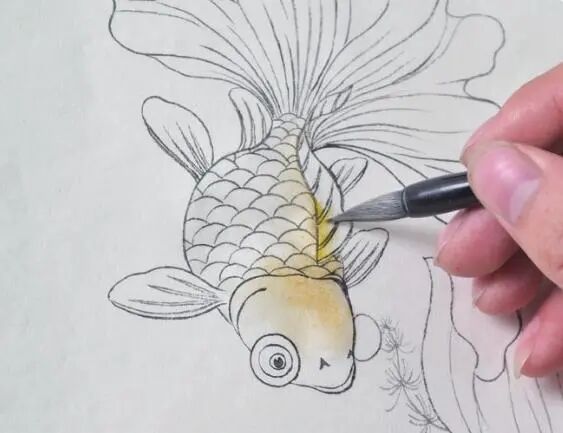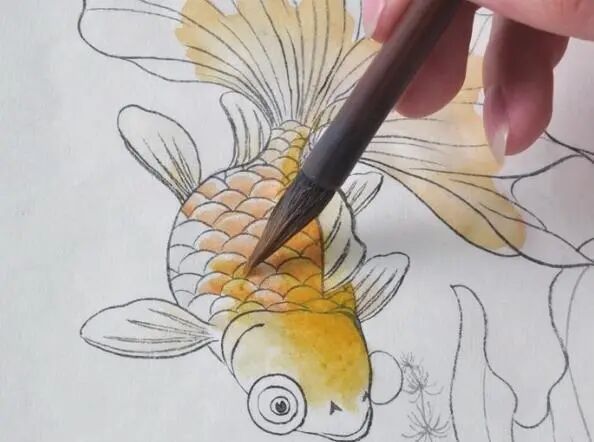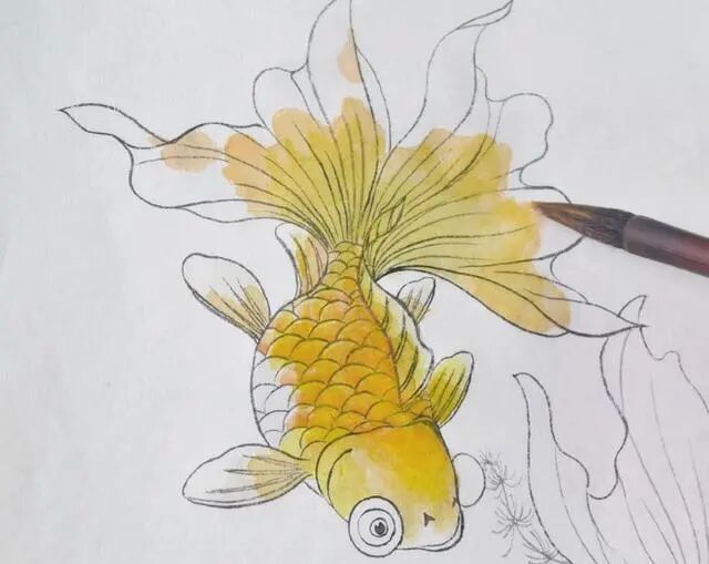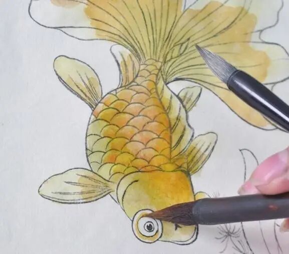 6、调和藤黄(稍多)与少许熟褐,蘸满笔尖,以清水笔辅助,对金鱼进行第2遍分染。