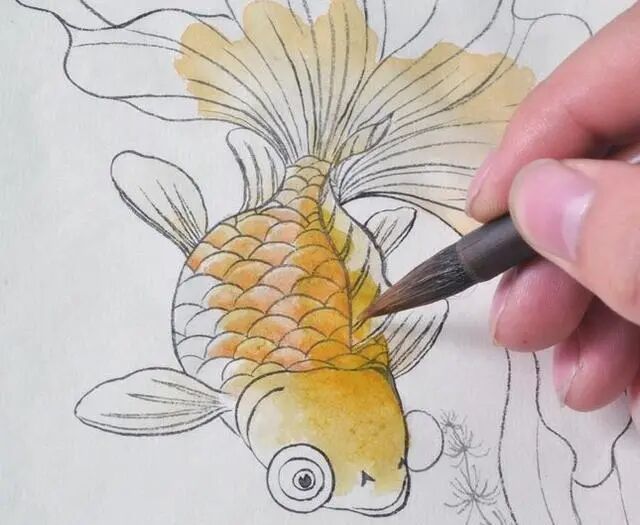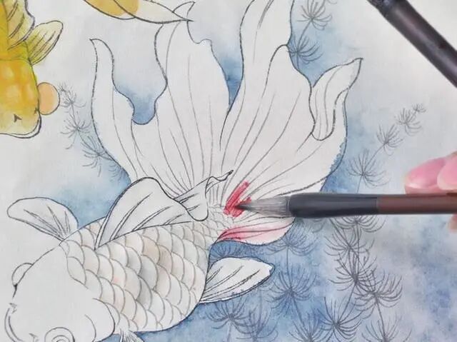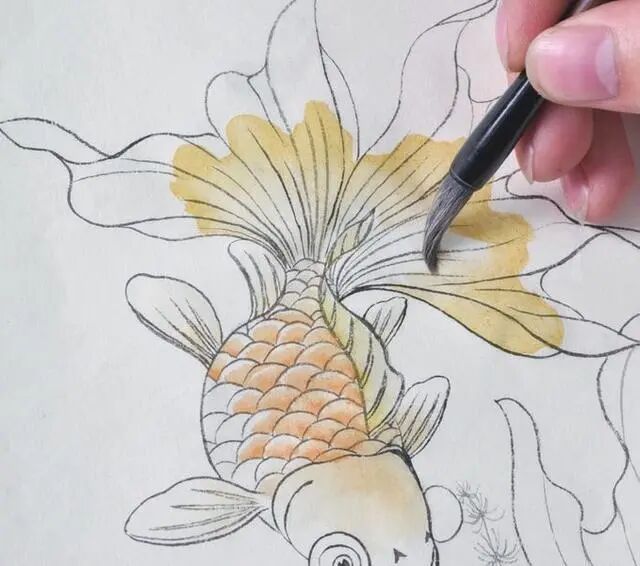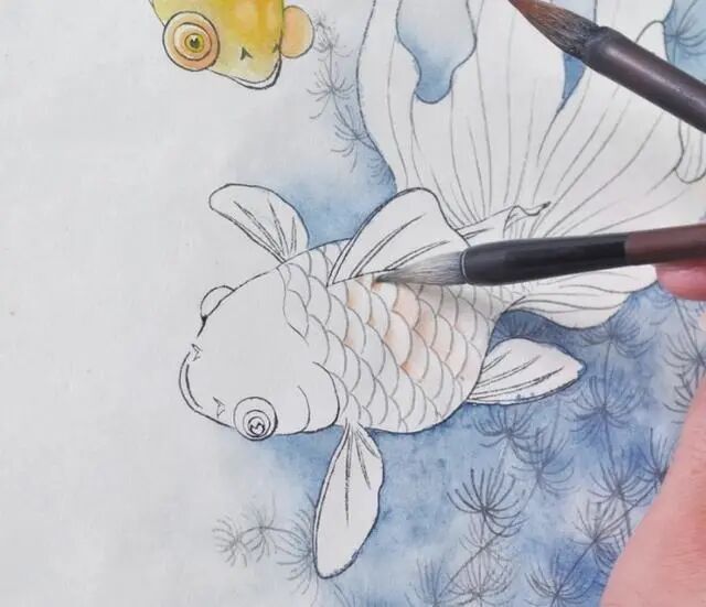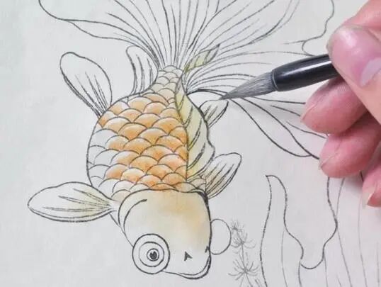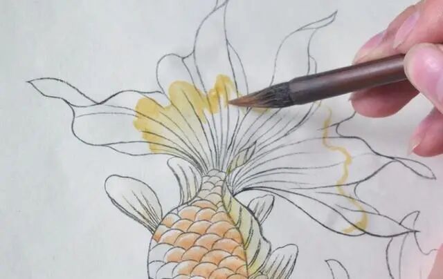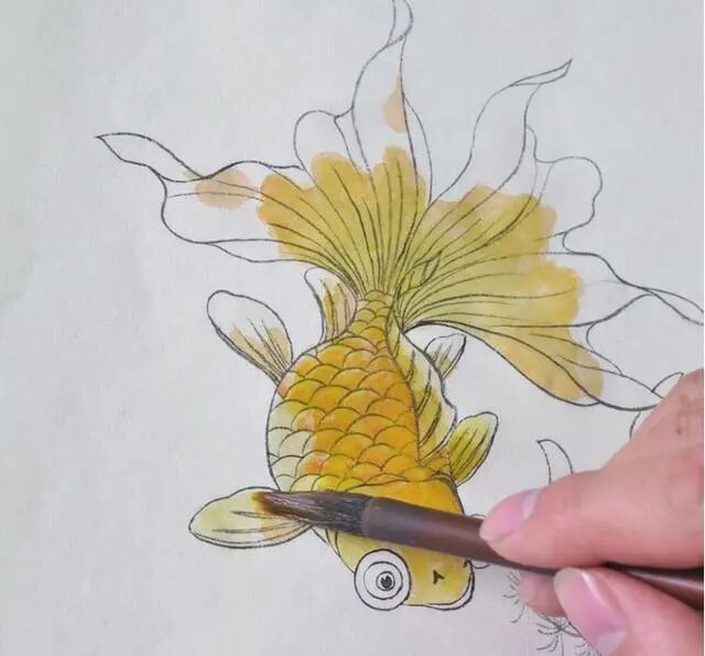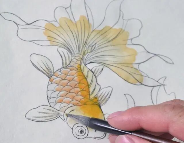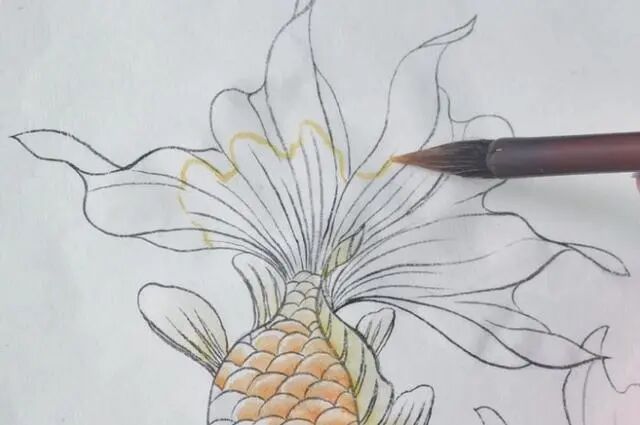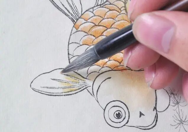 11、小号羊毫笔,用清水调和朱磦,颜色调淡,蘸满笔尖,以清水笔辅助,分染鱼鱗。