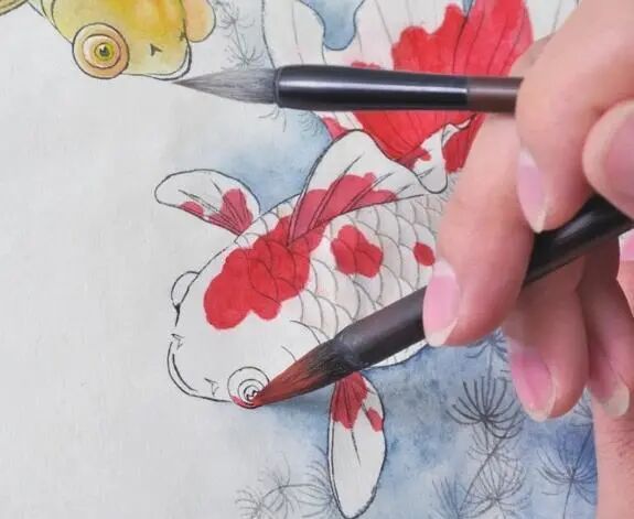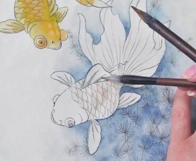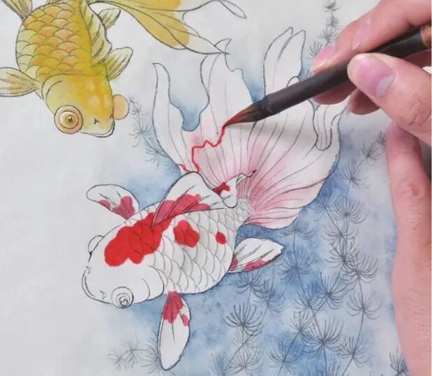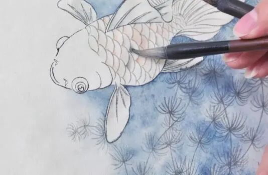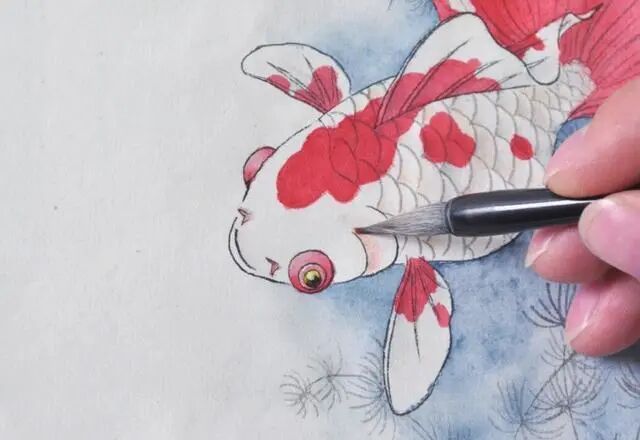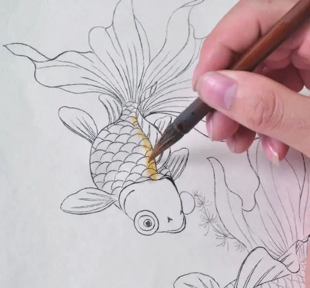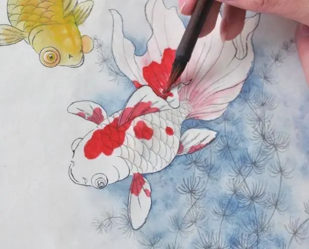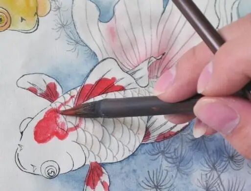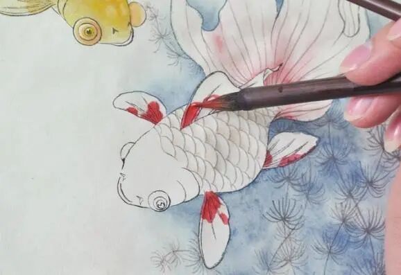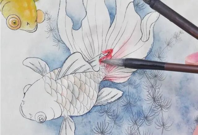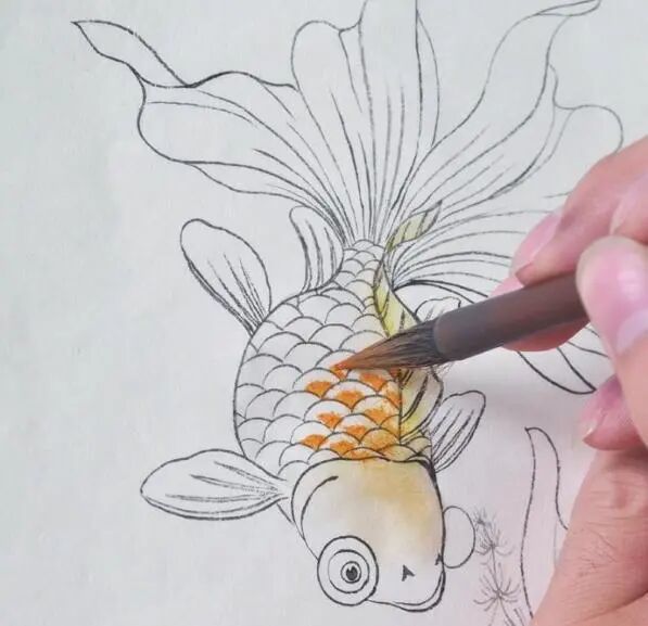 11、小号羊毫笔,用清水调和朱磦,颜色调淡,蘸满笔尖,以清水笔辅助,分染鱼鱗。