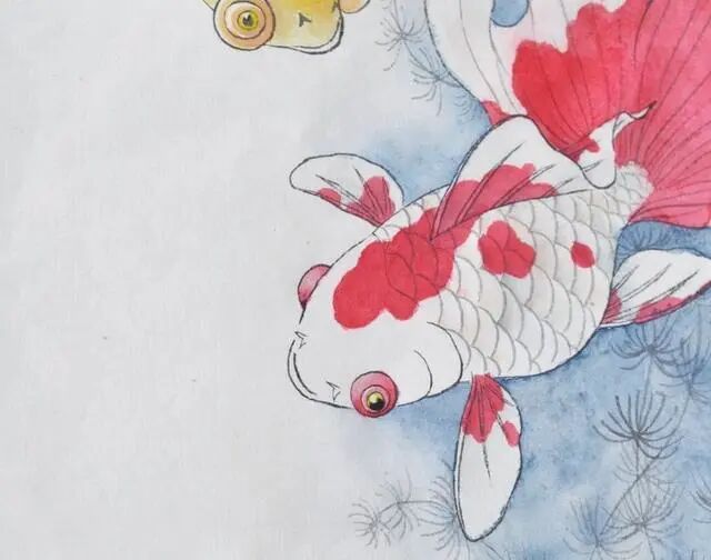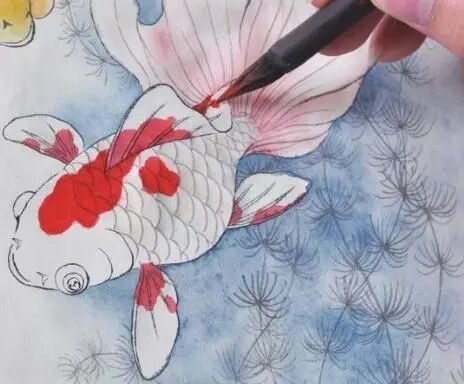 5、金鱼的鱼尾颜色分两层,分染时先染重色,待第2遍时,染淡色。