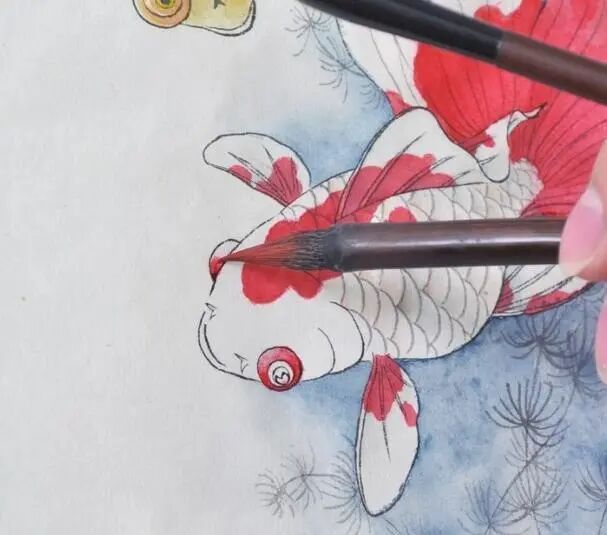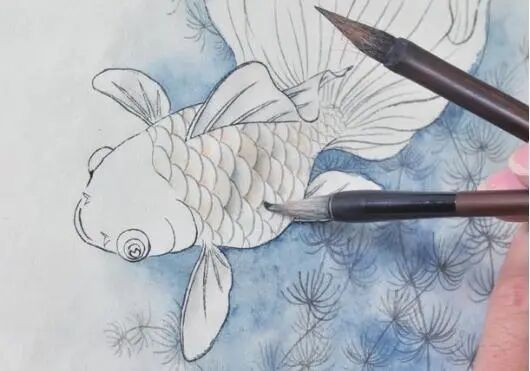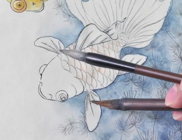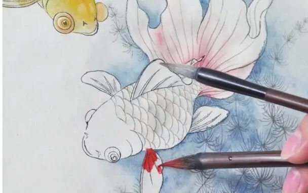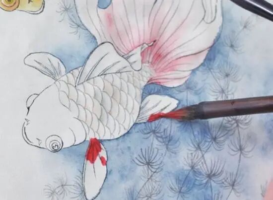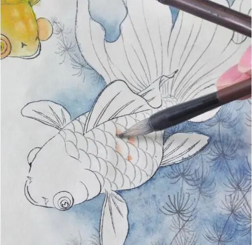 8、添加清水,将颜色调淡,蘸满笔肚,对金鱼的鱼鳍进行罩染。
