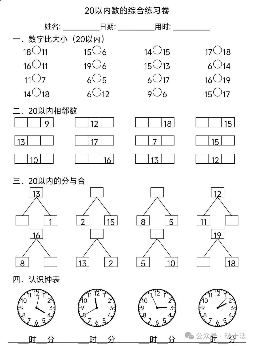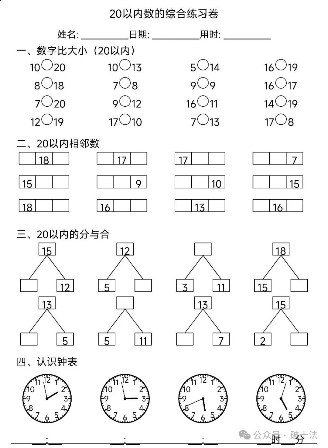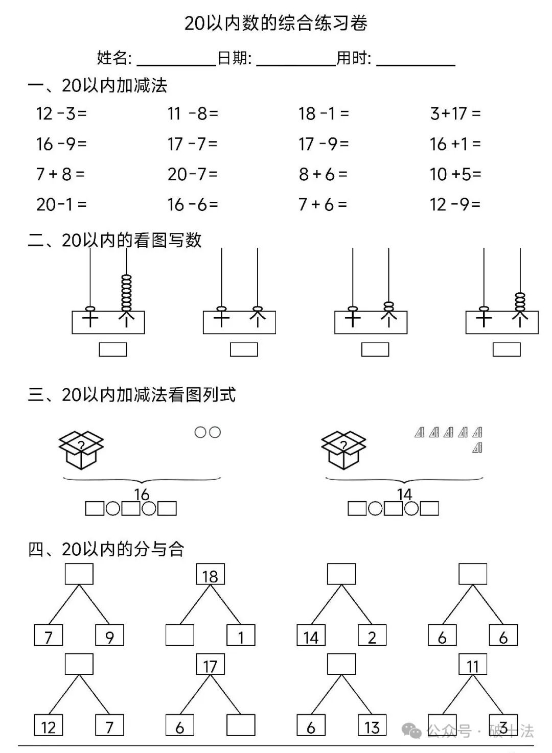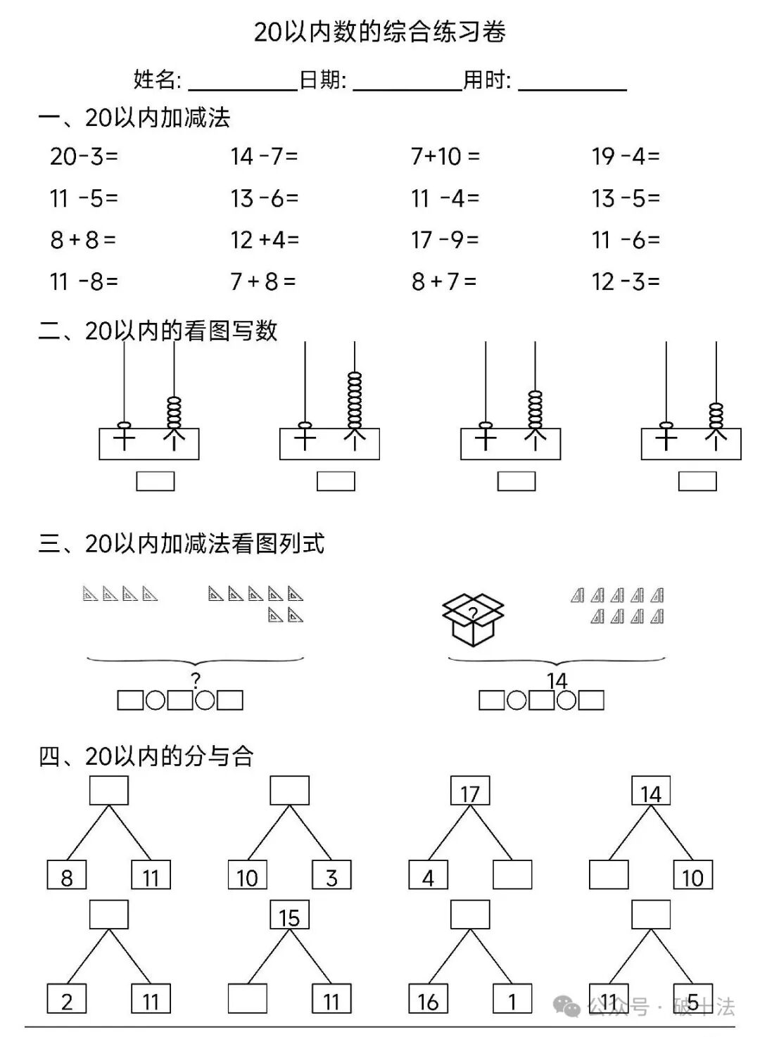 这份练习卷可以帮助孩子巩固10以内加减法,掌握凑十借十的技巧,为20以内加减法的学习打下基础,并提升孩子的数学思维能力。![]()